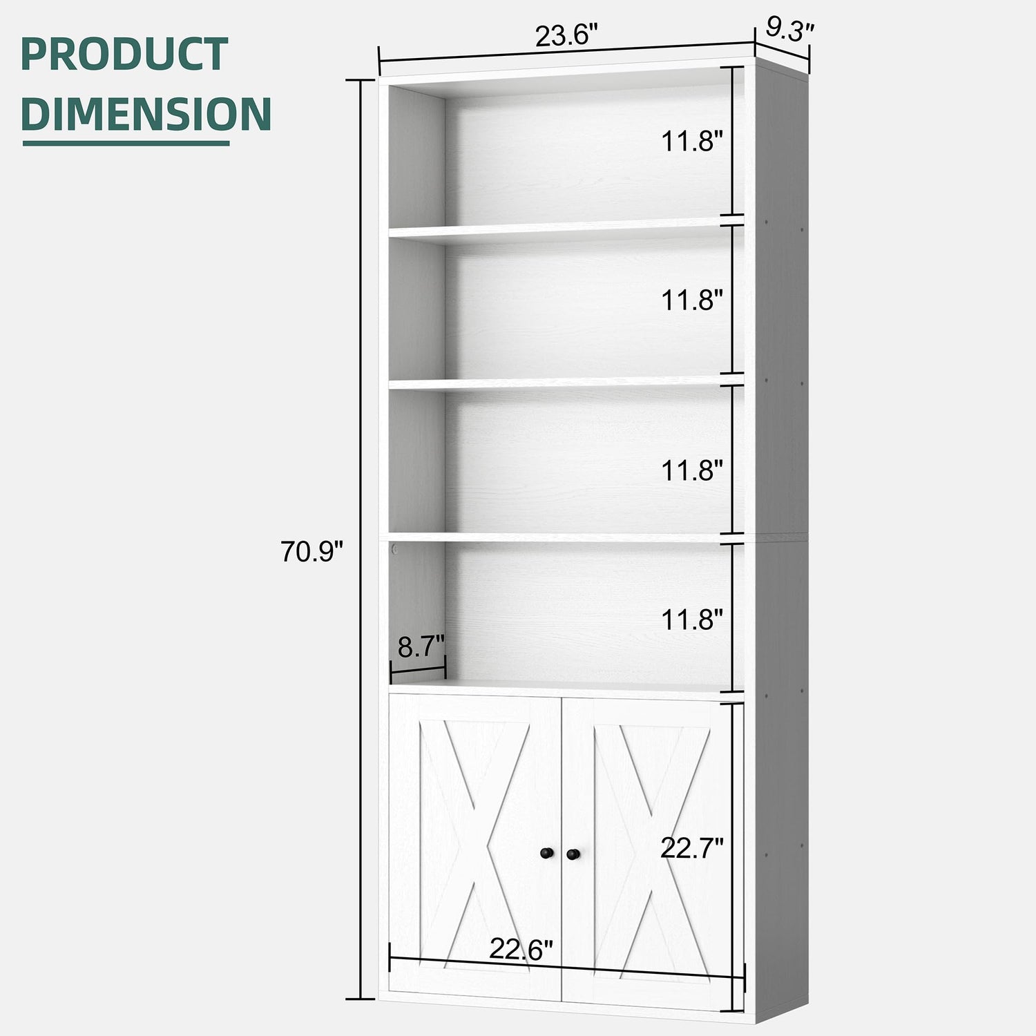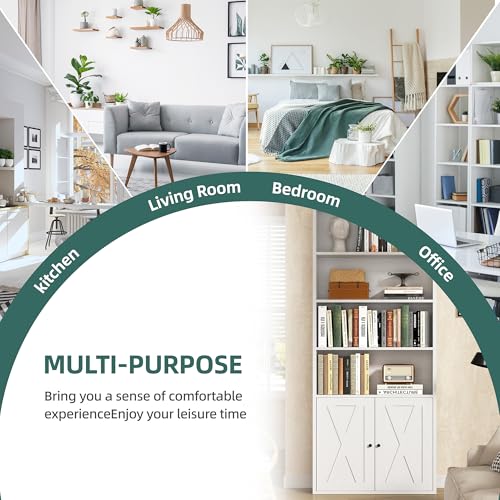 Shintenchi Bookshelf, Industrial Bookshelves and Bookcases with Doors Floor Standing 6 Shelf Display Storage Shelves 70.6 inches Tall Bookcase for Home Office, Living Room (White)
