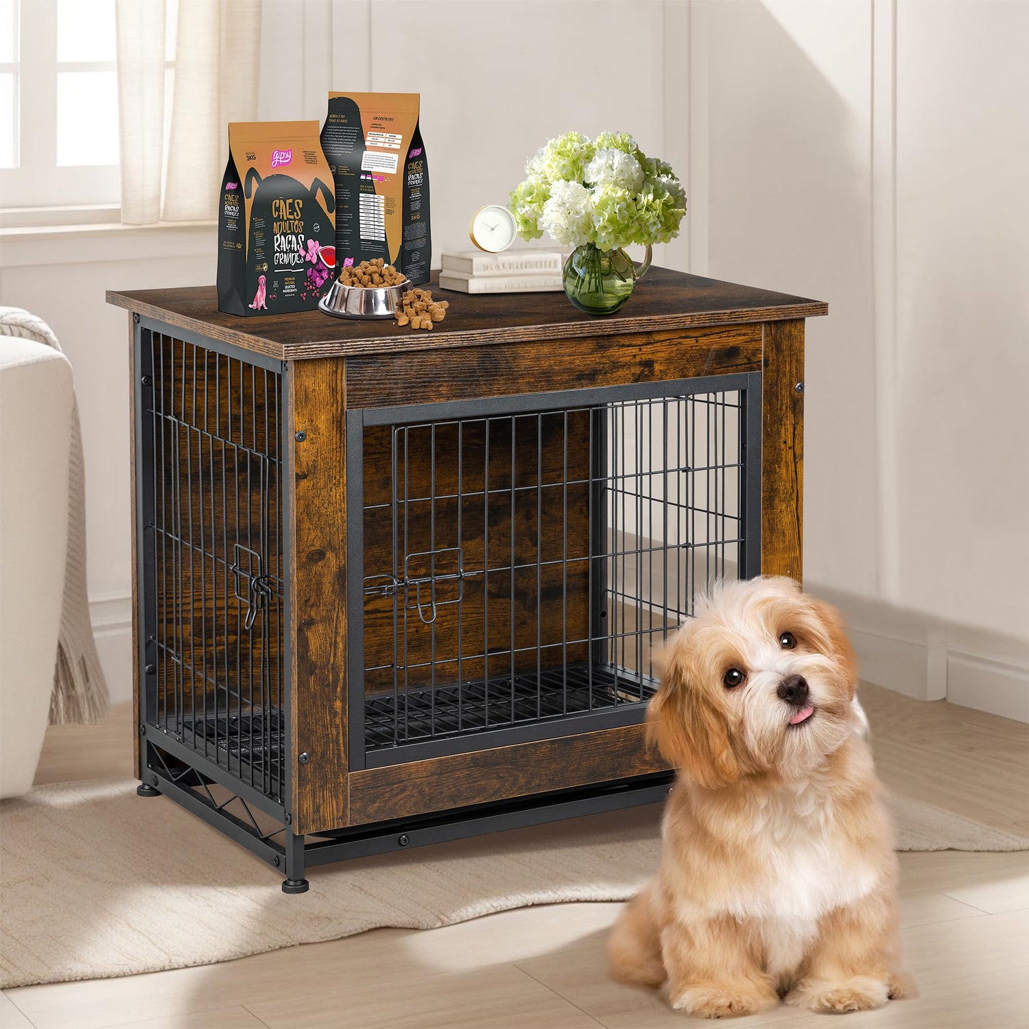 Details: Shintenchi Dog Crate Furniture, Double-Doors Kennel Indoor with Removable Tray, End Table Dog House for Small Breed, 27.2"L, Brown