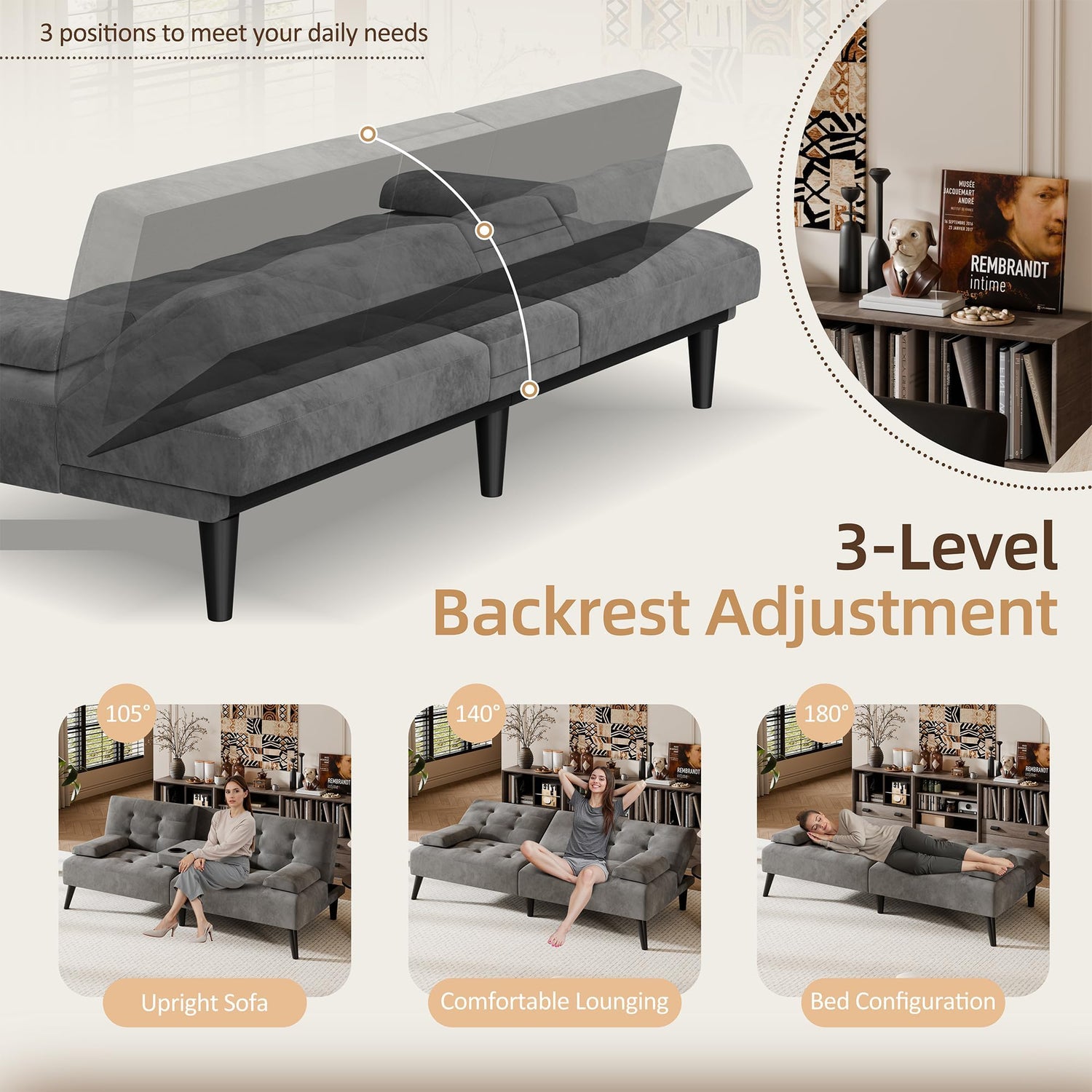 Shintenchi Futon Sofa Bed, Velvet Foldable Couch Reclining Sleeper w/Removable Armrests, Upholstered Loveseat w/Folding Cup Holders for Home, Office, Dark Gray