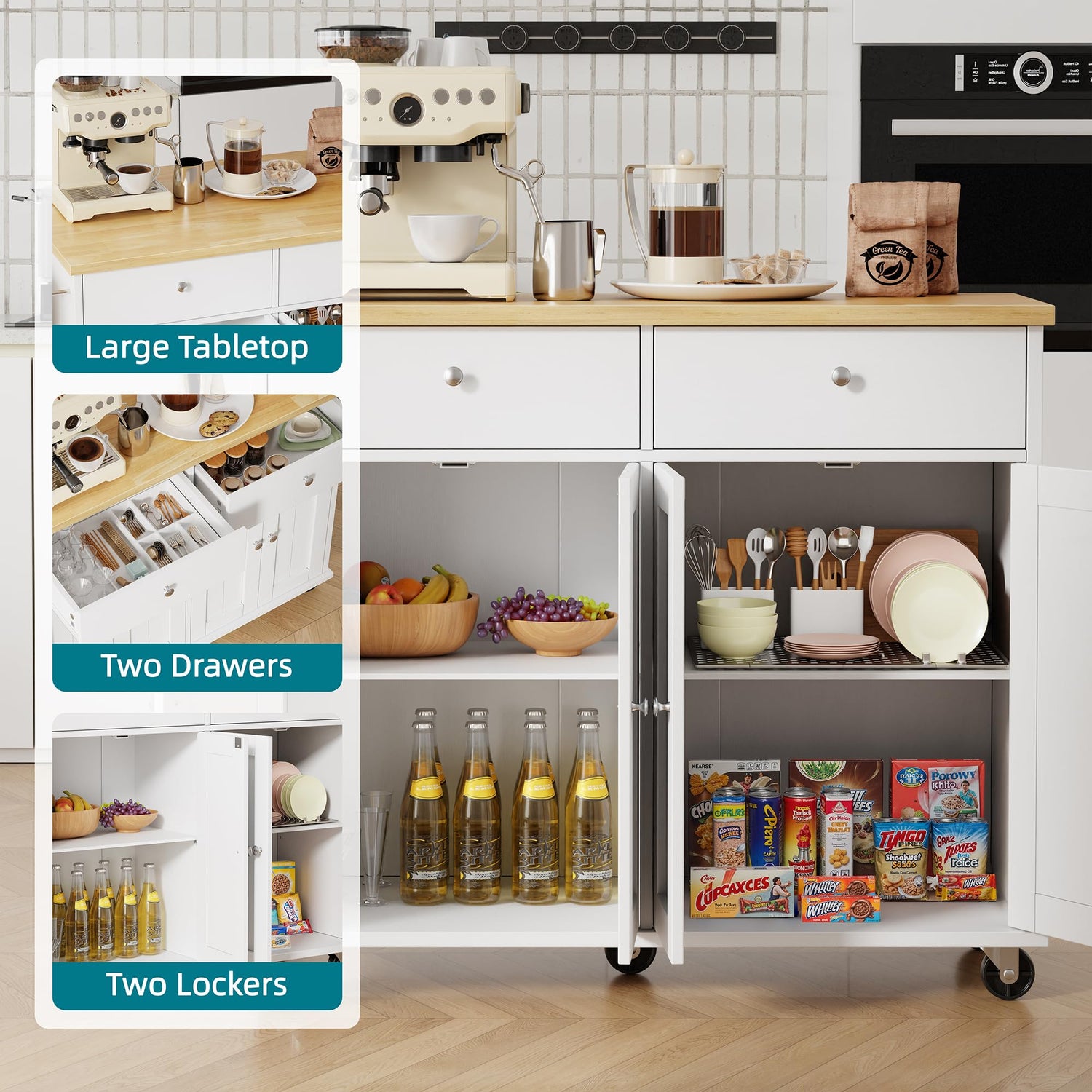- Universal Rolling Wheels: Smooth-rolling wheels allow easy relocation to any room, while locking mechanisms secure the island in place. Keep essentials handy wherever you work, whether in the kitchen, dining area, or entertaining space.