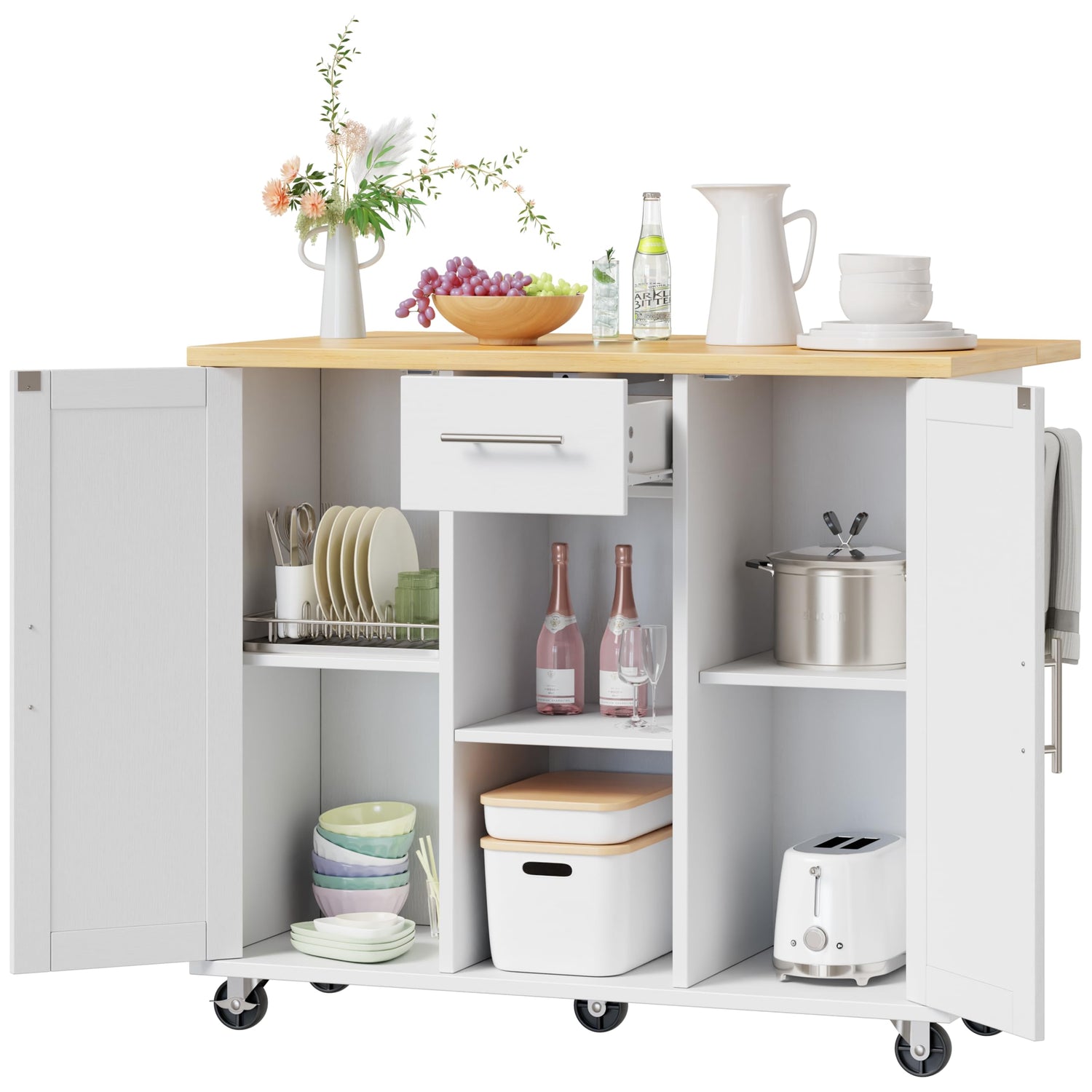 Shintenchi Kitchen Island with Storage, Bar Cart Cabinet Island Table on Wheels, Rolling Microwave Cart for Kitchen with Drop Leaf, Drawers, Towel Rack, Seating Area for Dining Room, White