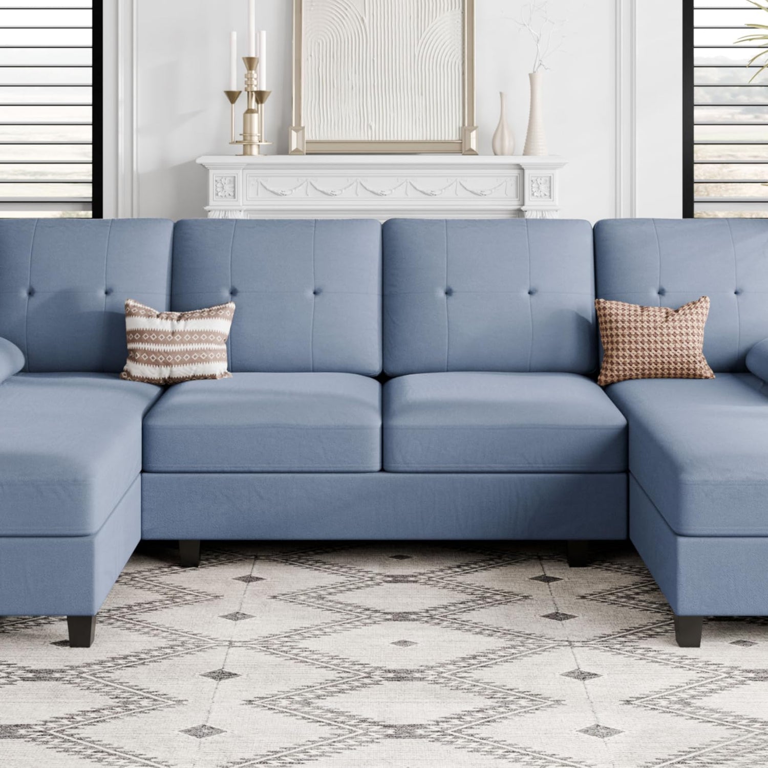 Shintenchi Sectional Couches for Living Room, U Shaped Sofa Couch with Double Chaise, 4-Seat Living Room Furniture Sets with Soft Cushion & Linen Fabric, Blue