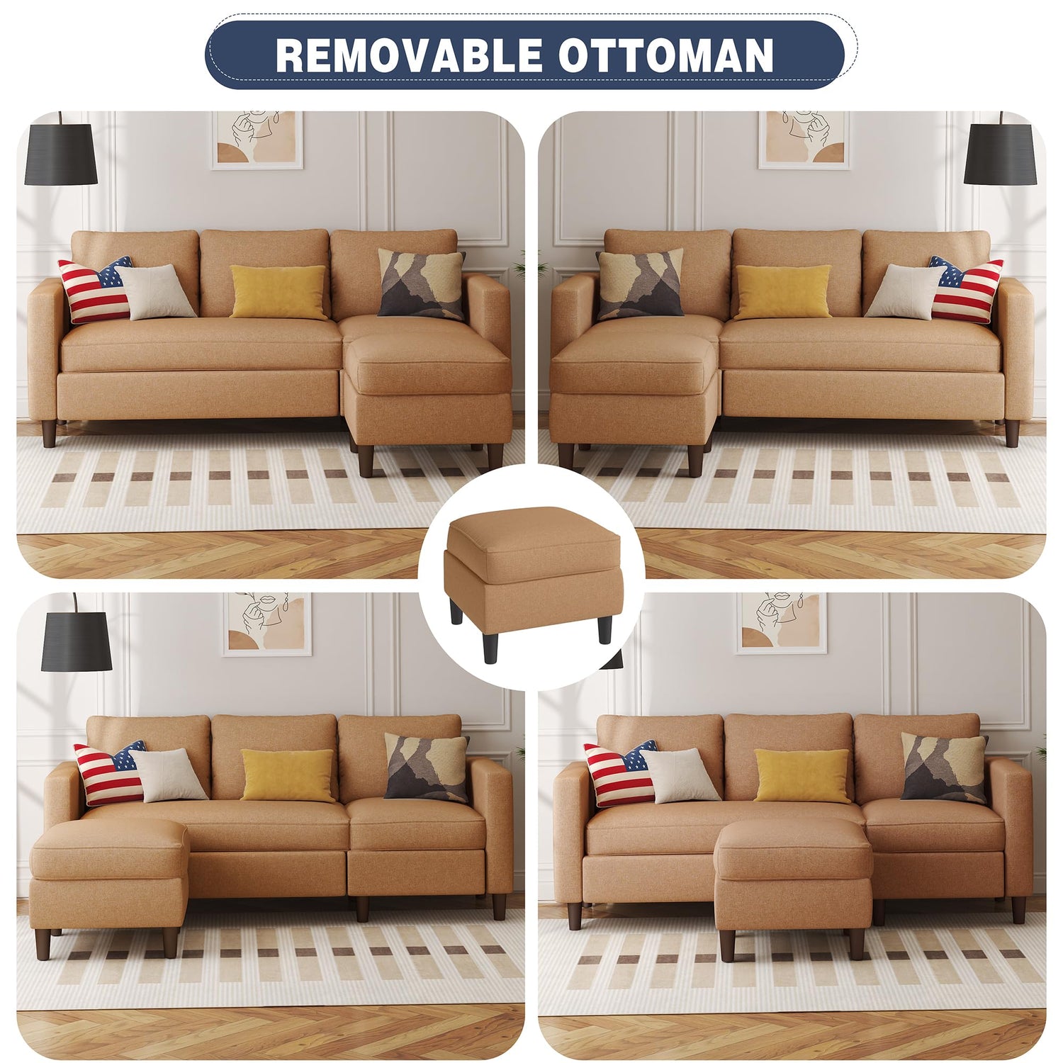 - Convertible Couch: This sectional couch sofa with a movable ottoman, you can place it on left or right of sofa couch to make up a chaise longue, which can take a nap at any time and change the style in your living room.