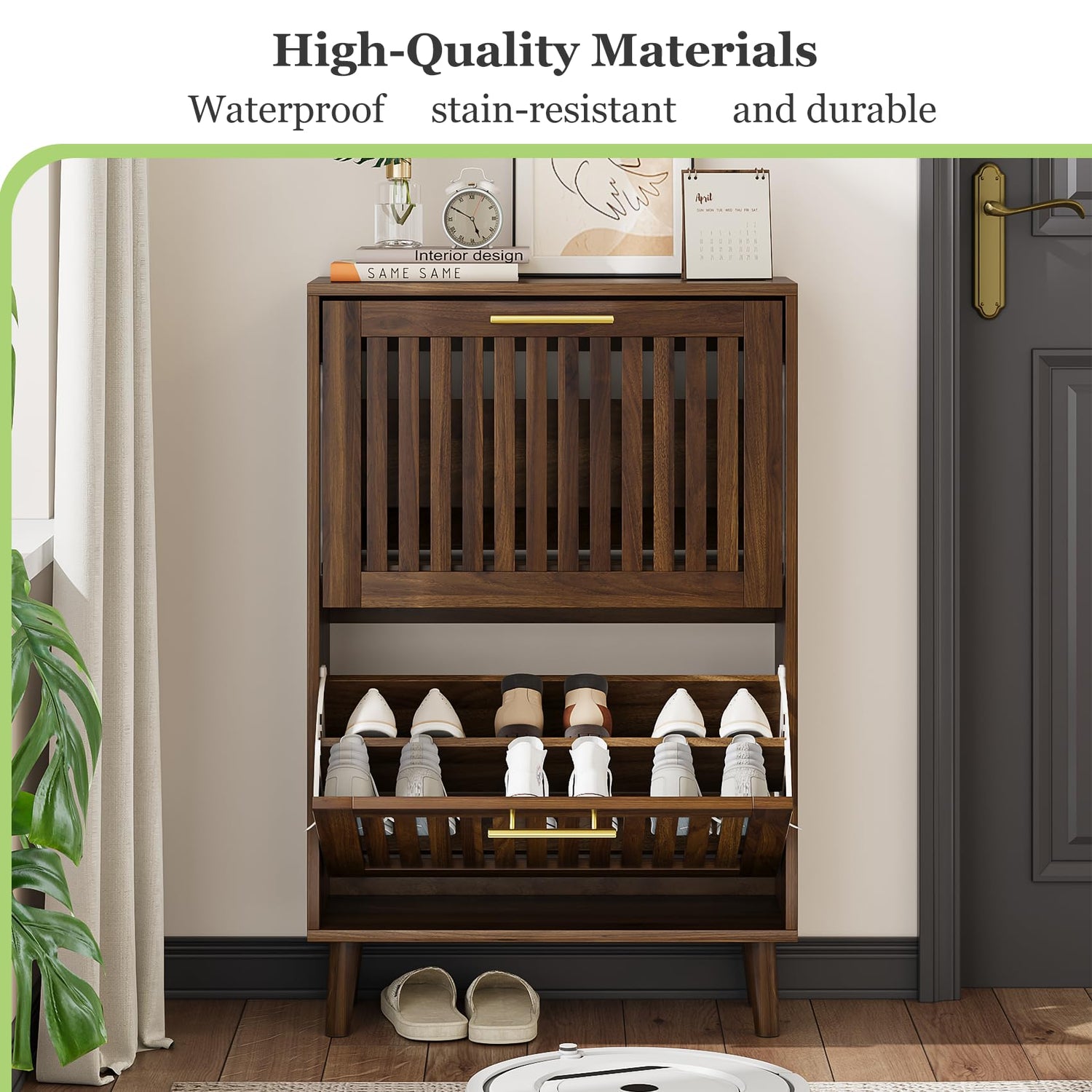 Shoe Cabinet, Shoe Storage Cabinet with Louvered 2 Flip Drawers, Narrow Shoe Cabinet Storage for Entryway, Freestanding Shoe Organizer Cabinet with Golden Handles, Slim Shoe Rack Cabinet (Walnut)
