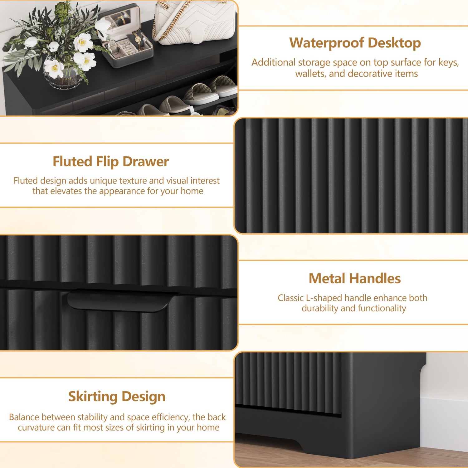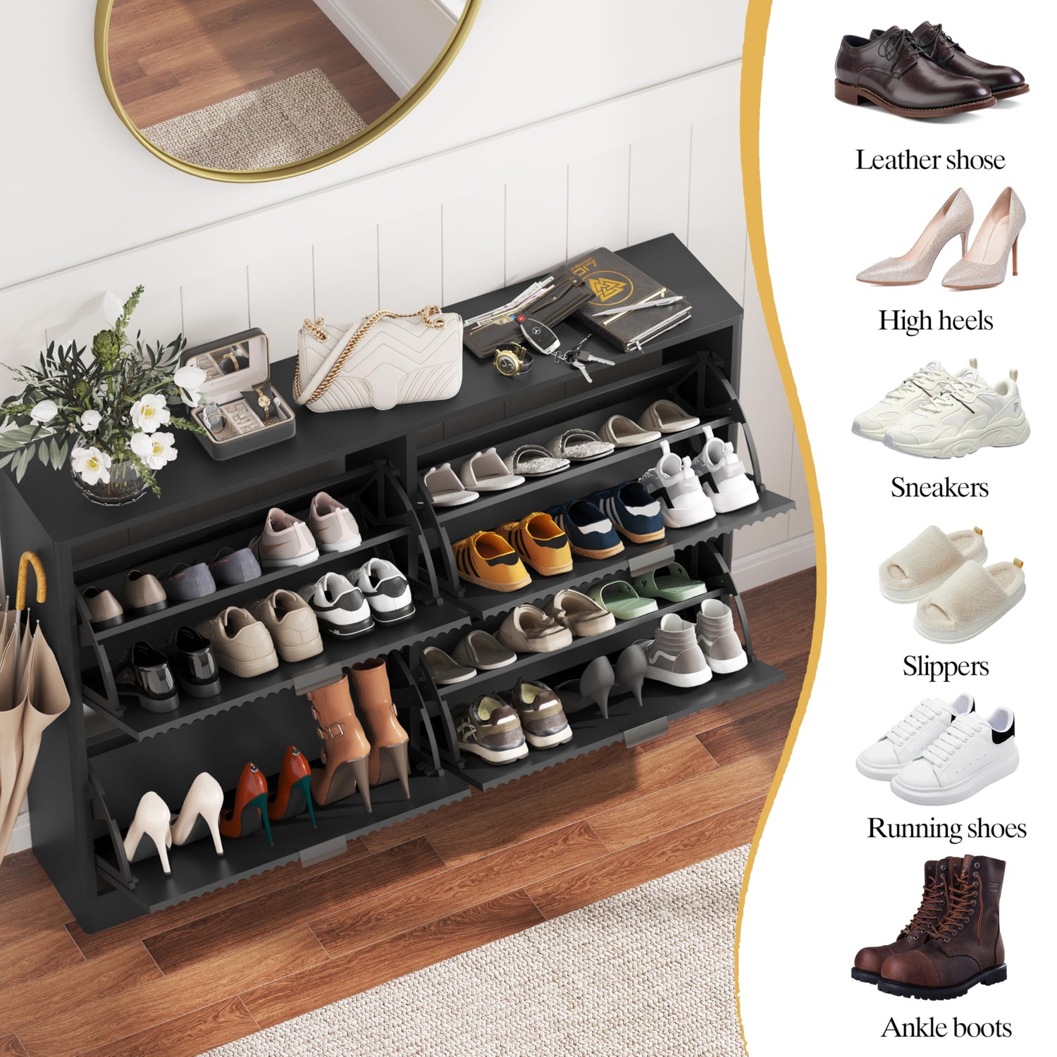 - 【MULTIFUNCTIONAL & DURABILITY】Black shoe organizer cabinet is equipped with 4 flip drawers, each flip drawer has 1 adjustable shelf. And you can remove or adjust shelves to accommodate different shoe sizes and styles. Spacious open storage space on top for keys, wallets, picture frames, plants, etc. So easily you accessing!