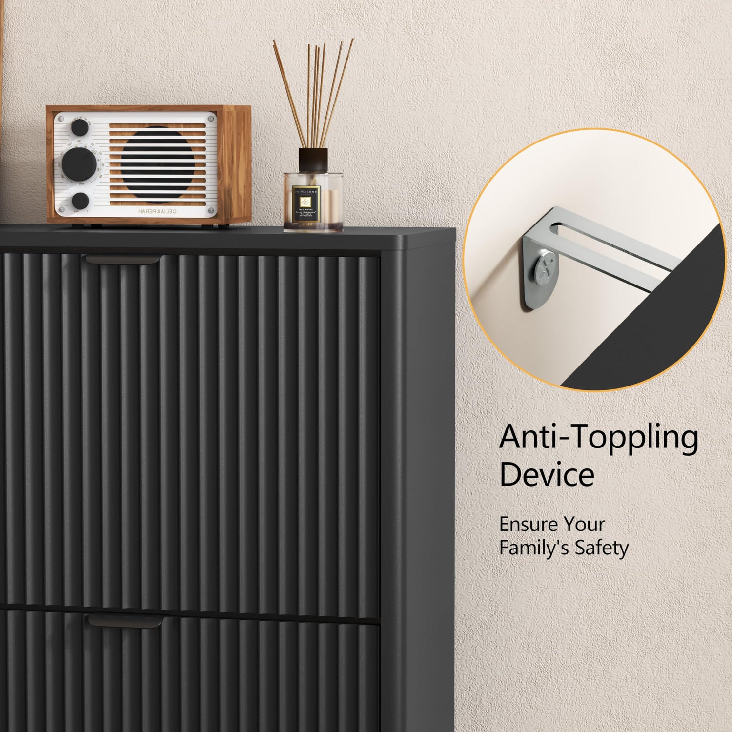 - 【ANTI-TIPPING PROTECTION】Wooden narrow shoe storage for entryway is equipped with anti-tipping devices that anchors it better to the wall, and secures the freestanding shoe racks against accidental tipping or shaking. Also, sturdy wood base of shoe holder cabinet provides much stronger support, ensuring stability and your family's safety.