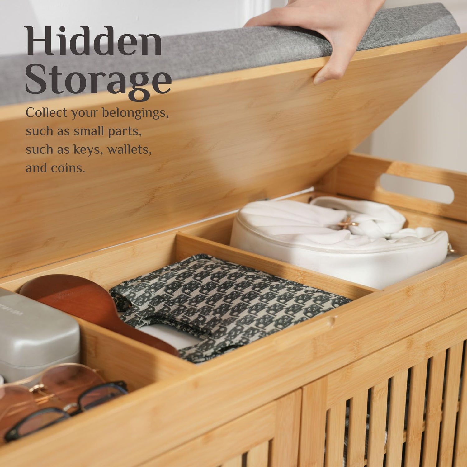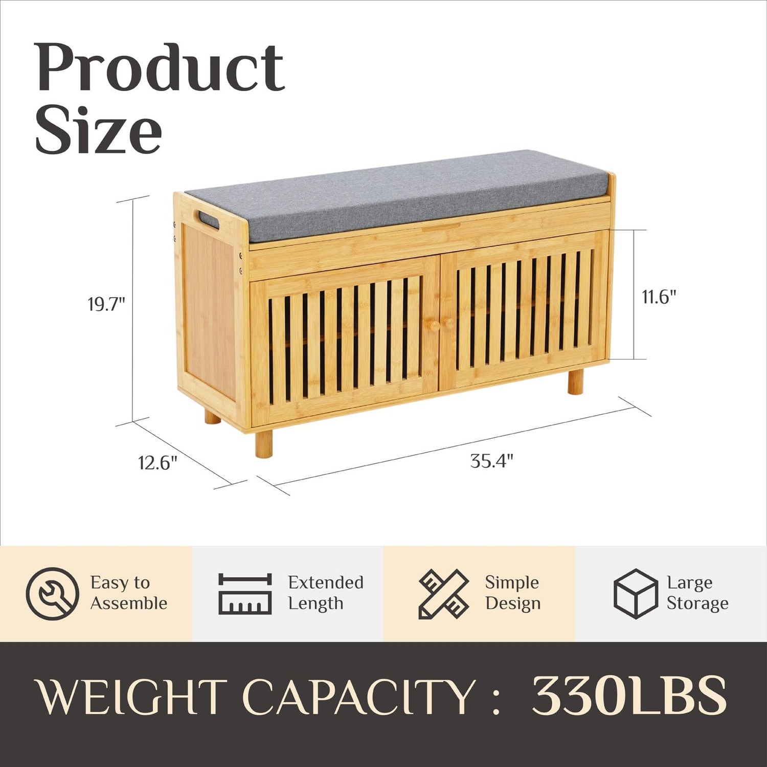 Shoe Storage Bench, Bamboo Entryway Bench with 2 Doors & Padded Seat Cushion, 2 Tier Shoe Rack, 35.4" W x 12.6" D x 19.7" H, Shoe Cabinet Organizer for Entryway, Living Room, Bedroom, Hallway, Nature