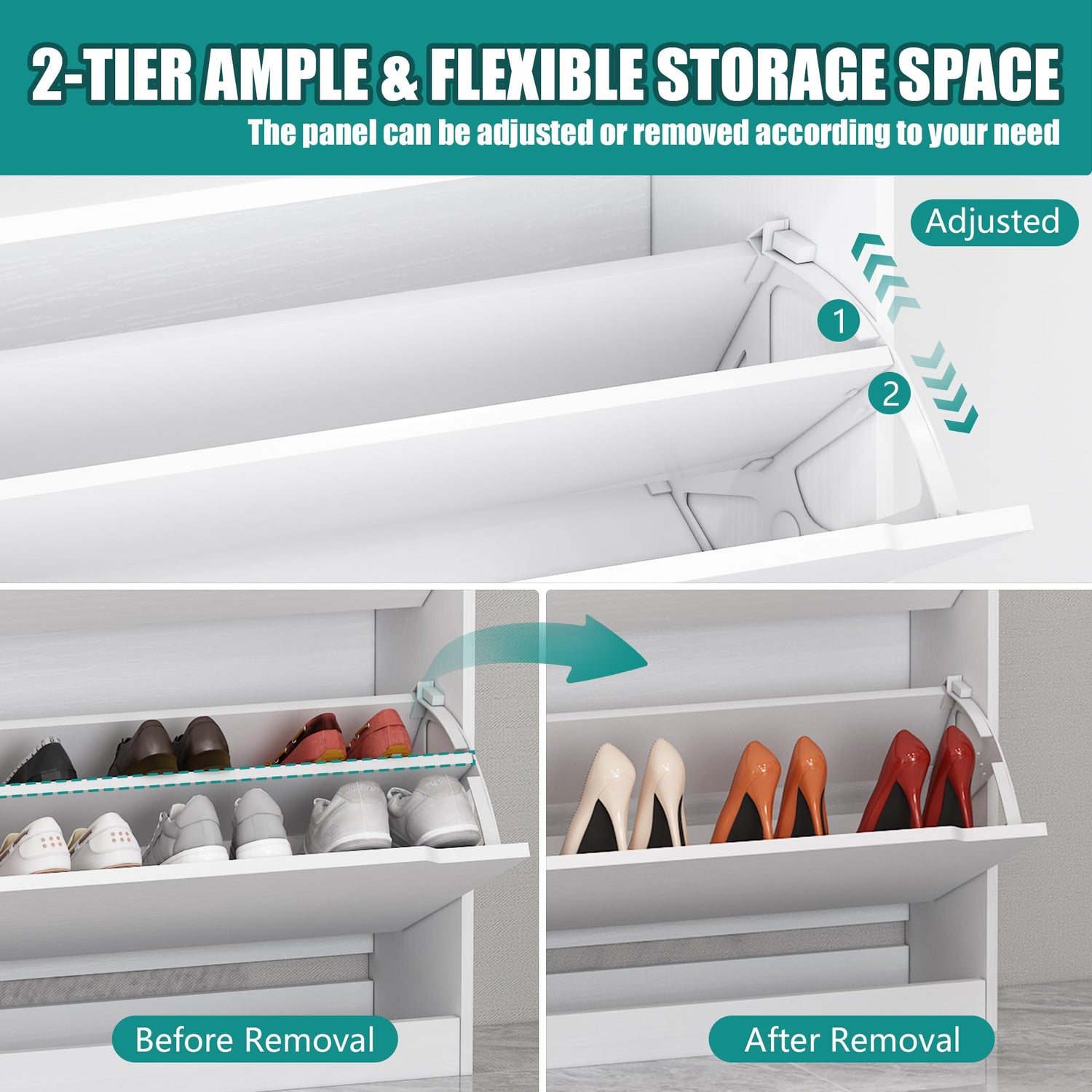 - 🌲MULTIFUNCTIONAL SHOE CABINET: This shoe cabinet is versatile and can accommodate different types of shoes, including heels, sneakers, flats, and boots. Each flip-out drawer features an ADJUSTABLE or REMOVABLE panel in the middle, allowing you to customize the storage space based on the size and shape of your shoes.