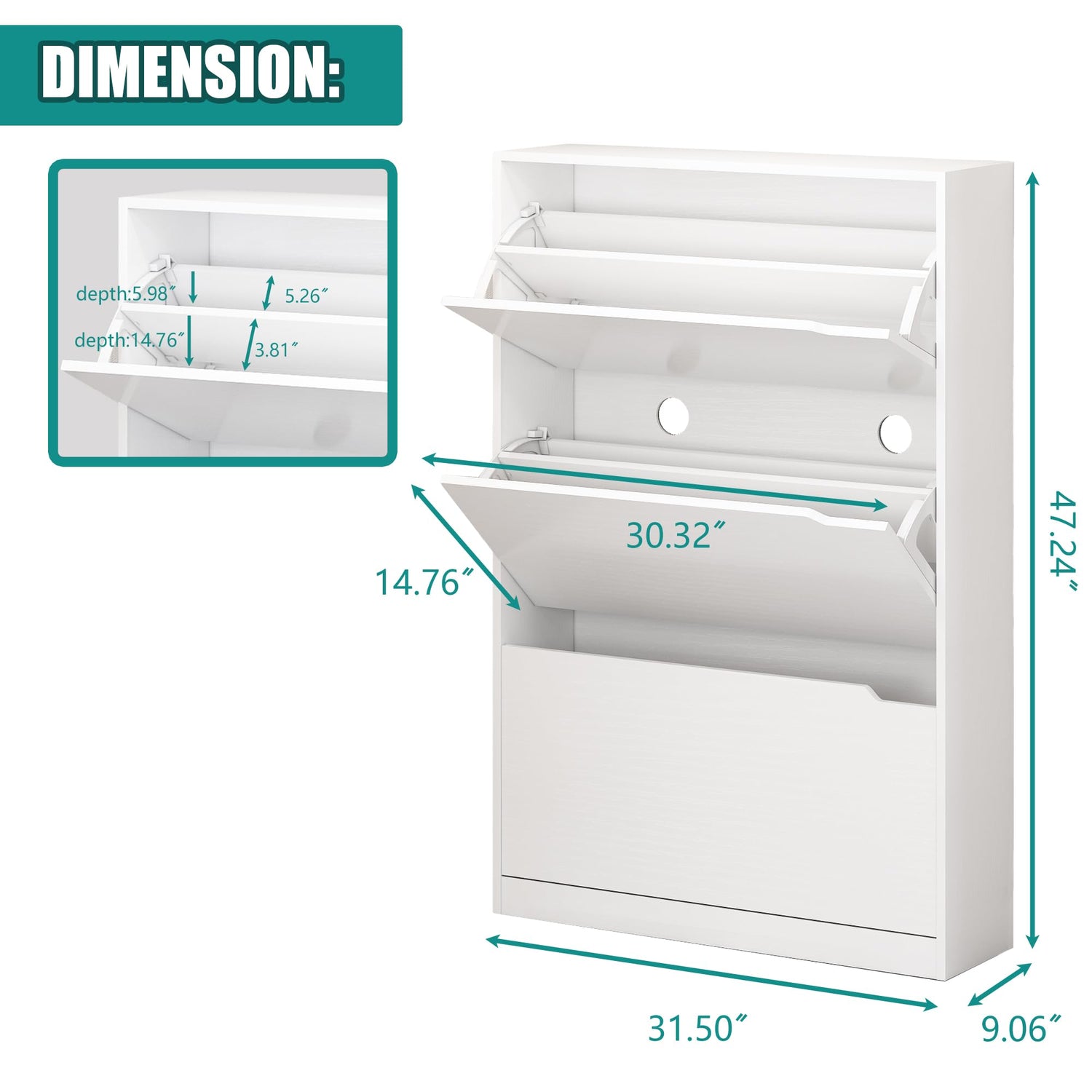 - 🌲LARGE CAPACITY: The freestanding shoe cabinet can store up to 24 pairs. Measuring 31.5"x 9.06"x 47.24", it is equipped with 3 flip-out drawers, each drawer containing two layers of storage space. The spacious top platform of the shoe organizer can be used to place wallets, keys, and accessories, providing practical storage while maintaining an aesthetic design.
