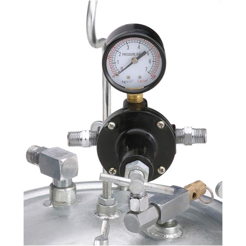 With a 2-1/4 Gallon capacity, this Paint Tank features a galvanized steel tank, double output regulator and pressure relief/safety valve. Lid gasket and clamps stay attached during lid removal. Works with any pressure feed HVLP or conventional spray gun. Maximum pressure is 45 PSI. Normal operating tank pressure is 25 to 30 psi Hose not included.