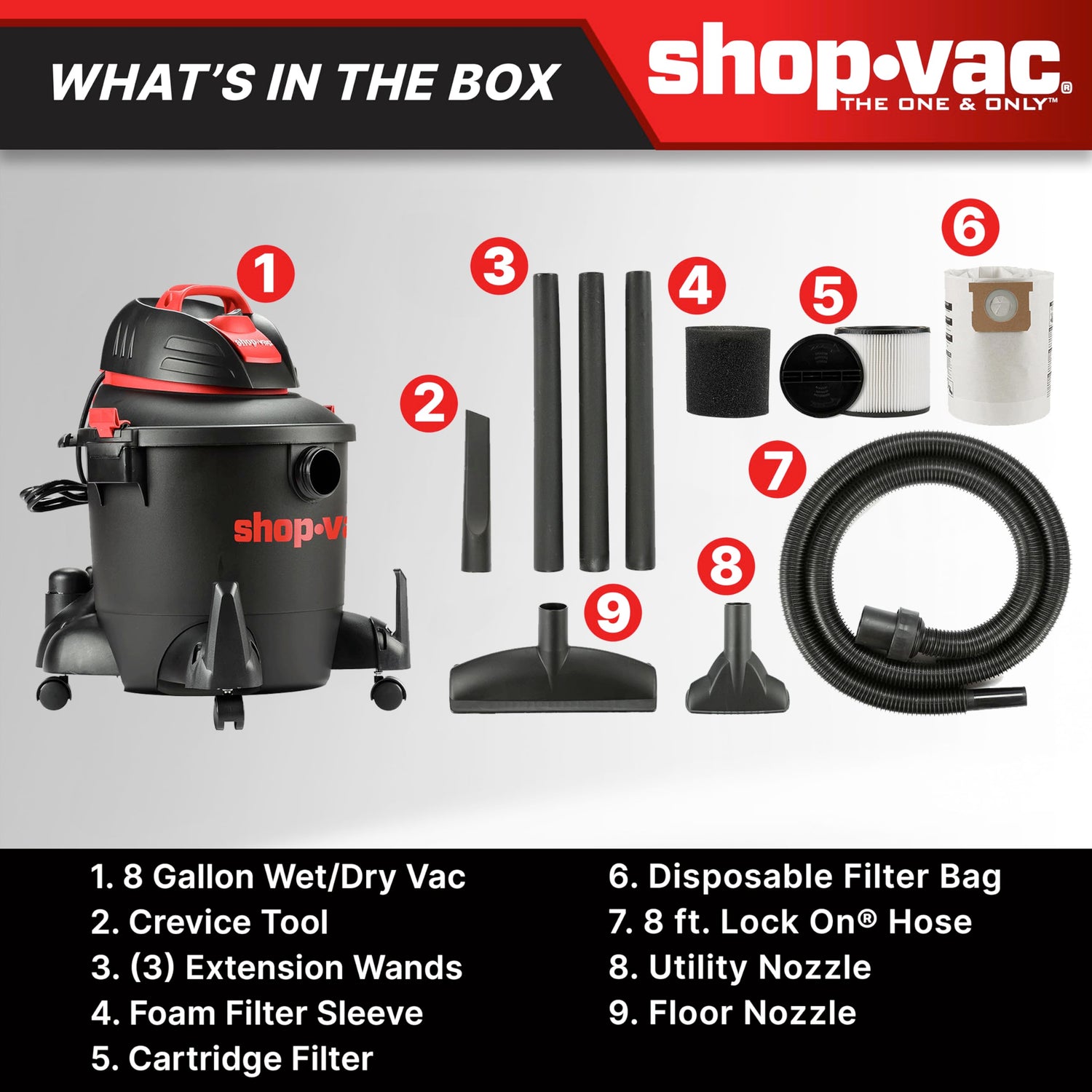 Details: 4.5 HP Motor, 6’ Power Cord, 1 ¼” Extension Wands (3), 1 ¼” x 8’ Lock-On Hose, 1 ¼” 10” Floor Nozzle, 1 ¼” Gulper Nozzle, 1 ¼” Crevice Tool, Cartridge Filter, Foam Filter Sleeve, Dry Collection Filter Bag