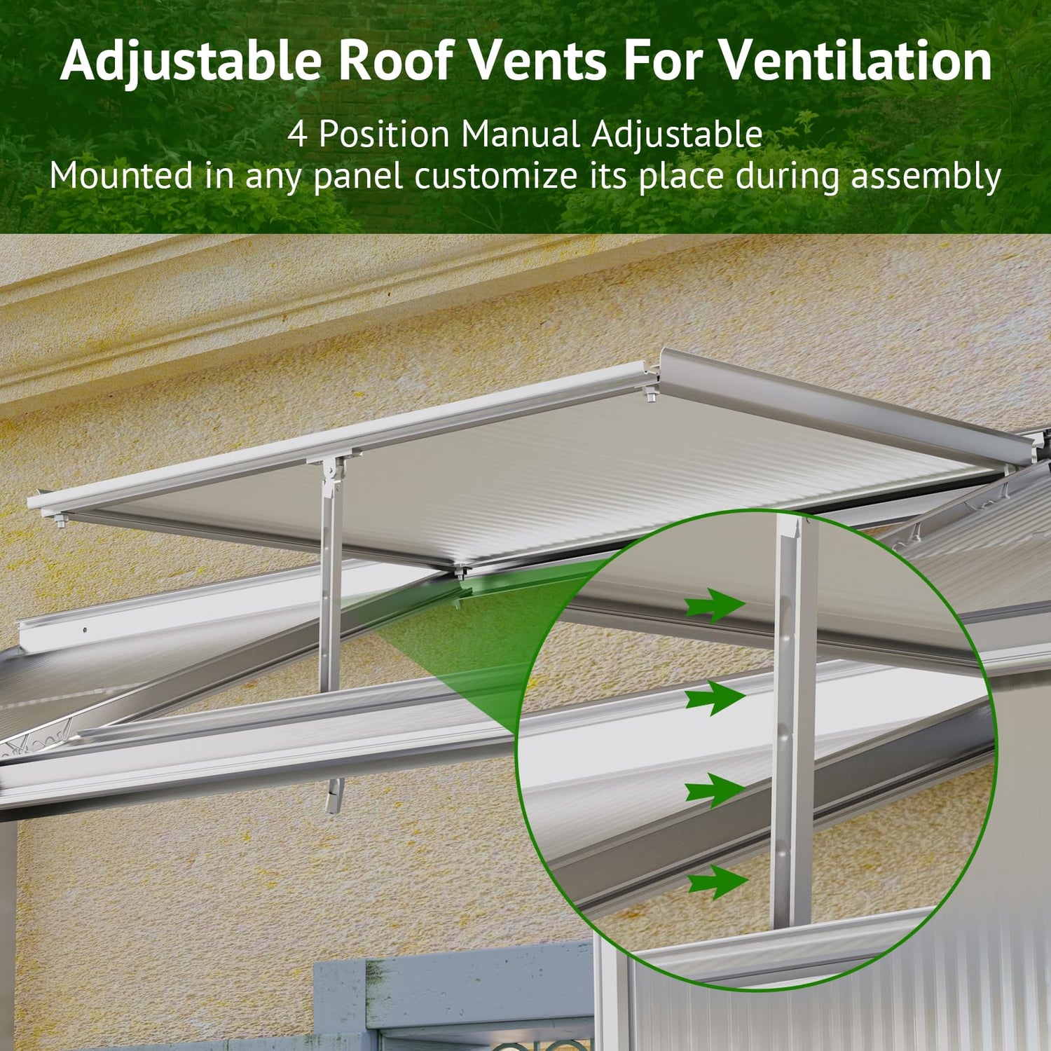- 【Friendly Ventilated & Drainable Design】:The Polycarbonate Greenhouse features ventilation windows and built-in gutter system. Not only can Provide continuously fresh air to your plants, but also efficient rainwater drainage and collection, by connecting a hose to gather rainwater for plant watering inside the hot house. The sliding swing door makes it easier to get in and out, while forming a ventilation circulation system to keep the Greenhouse cool and comfortable