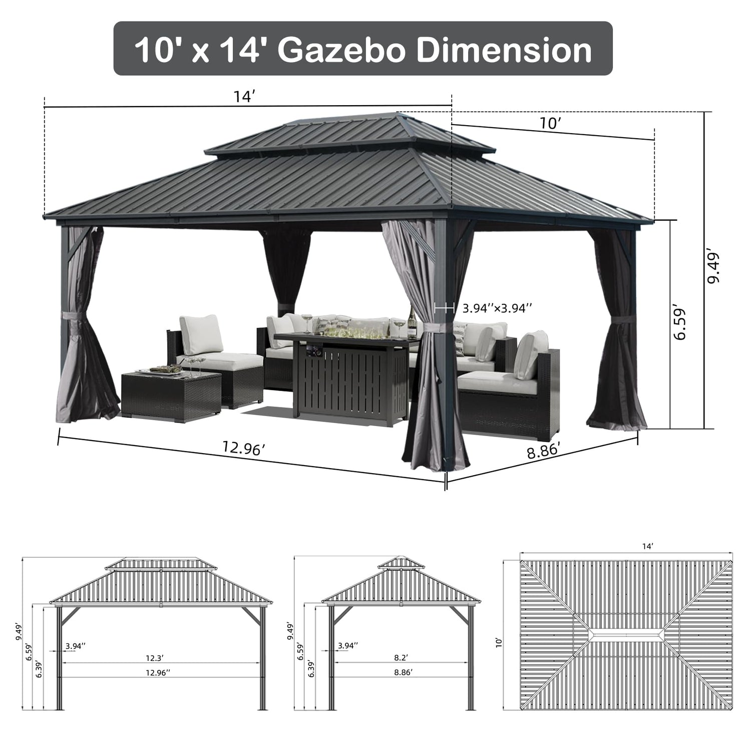 - Perfect Size for Outdoor Living- The SHPAI 10x14FT gazebo measures 14' L x 10' W x 9.5' H, offering 140 square feet of spacious comfort. Ideal for outdoor activities, gatherings, socializing, and relaxation.