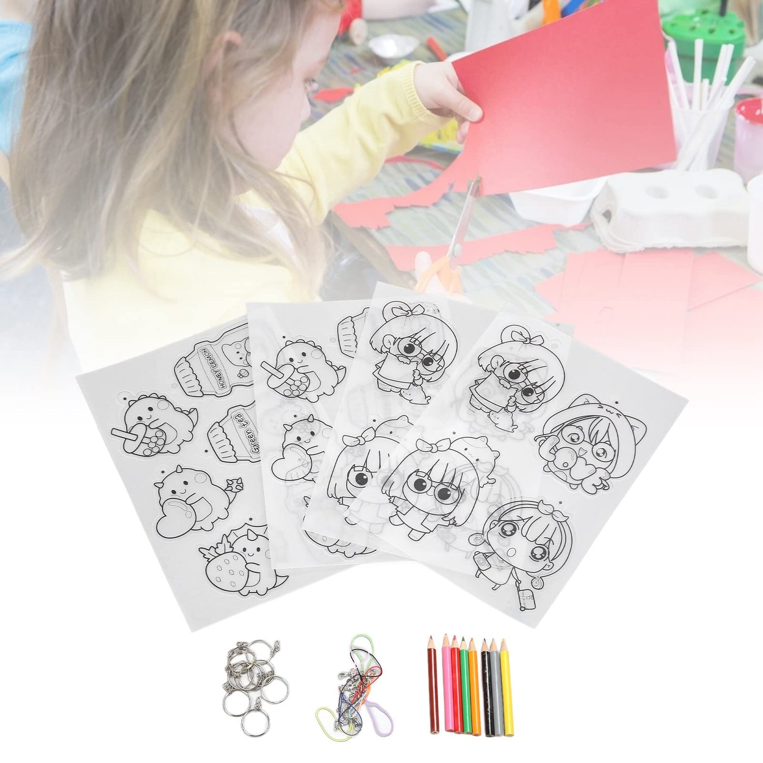 Shrinky Dink Sheets Set, Cartoon Dinosaurs and Girls Pattern Shrinky Plastic Sheet Kit with 10pcs Key Rings and Small Lanyards DIY Accessories for Crafts, Jewelry Making