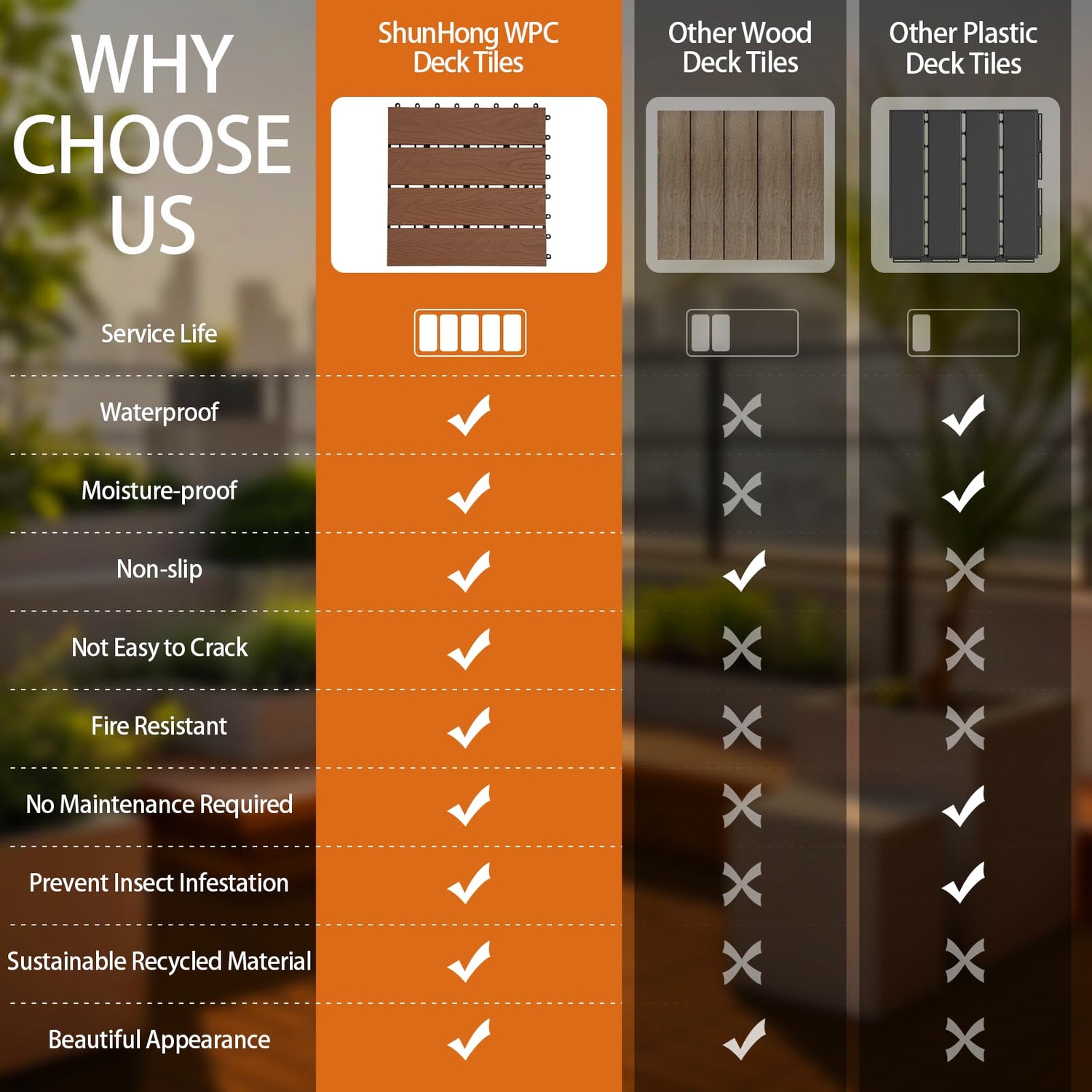 - 【Durable sturdy and Sustainable materials】: Shunhong uses high-quality sustainable polymer composite materials, integrating high-density polyethylene(HDPE) and recycled wood fibers, to infuse new life into waste resources. They are durable, waterproof, flame-retardant, not prone to deformation or cracking, and suitable for use in various climatic conditions. Their service life is longer than that of wooden tiles and plastic tiles.