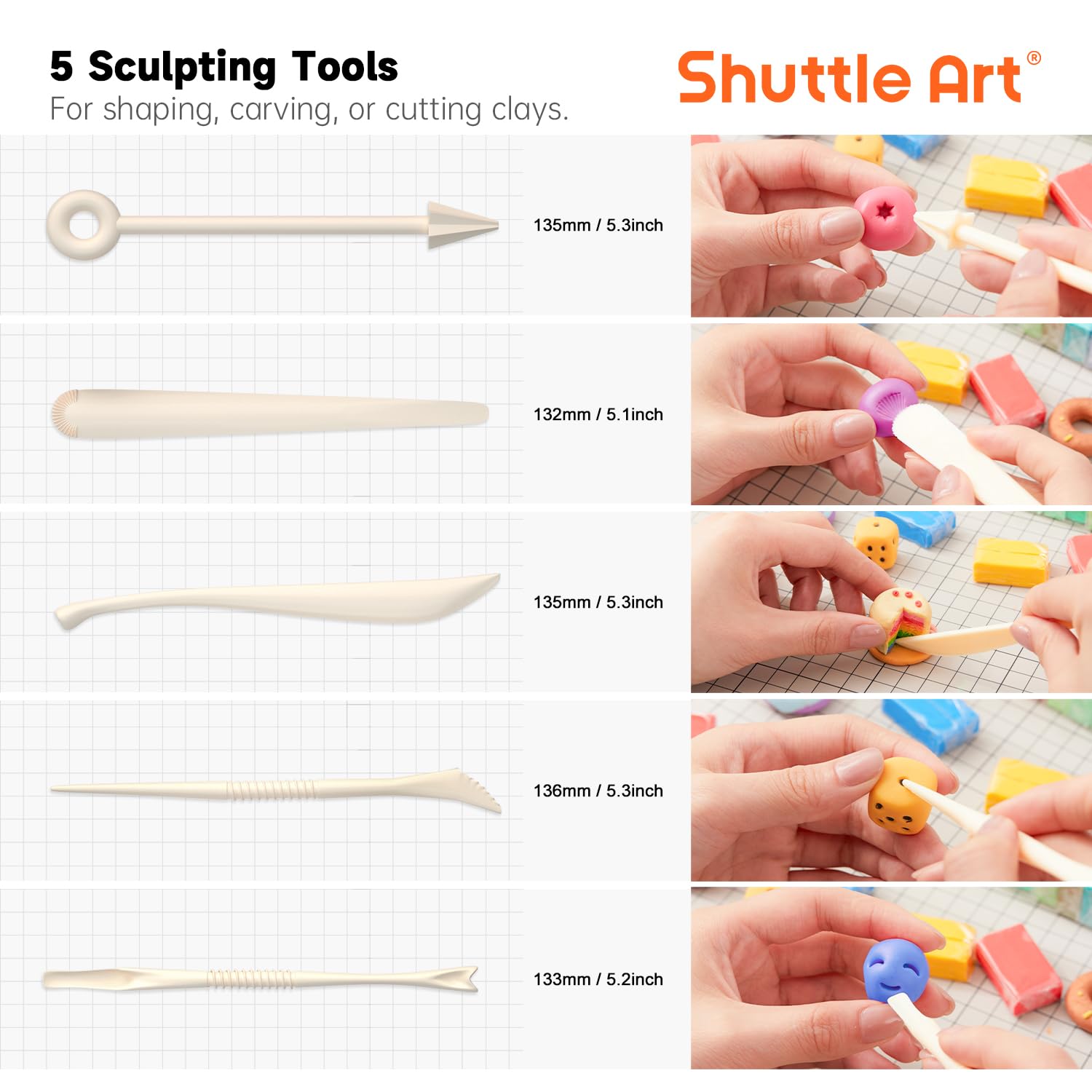 - 117 PCS POLYMER CLAY STARTER KIT: Shuttle Art polymer clay set includes 112 pieces of clay in 95 uqniue colors and extra 6 white, 4 black, 4 red and 4 yellow as supplement. Each clay piece weighs 0.35 oz/10 g, totaling 39.2 oz/1120 g in weight. The set also comes with 5 sculpting tools and a detailed user manual for beginners to start out