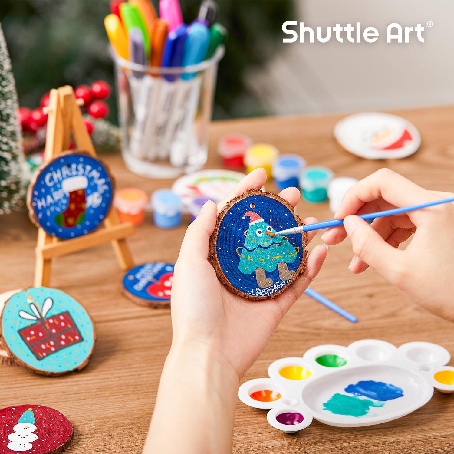 - VALUE WOOD SLICES KIT: Shuttle Art wood slices kit contains almost everything you need to create wooden decorations for holidays, including 70 pcs pre-dirlled wood circles, 2 sets of 12 colors acrylic paint, 4 brushes,12 colors permanent markers, 5 transfer stickers with different themes, jute twine, red ribbon and more, complete wooden Christmas craft kit for kids and adults. CHOKING HAZARD-not for children under 3 yrs