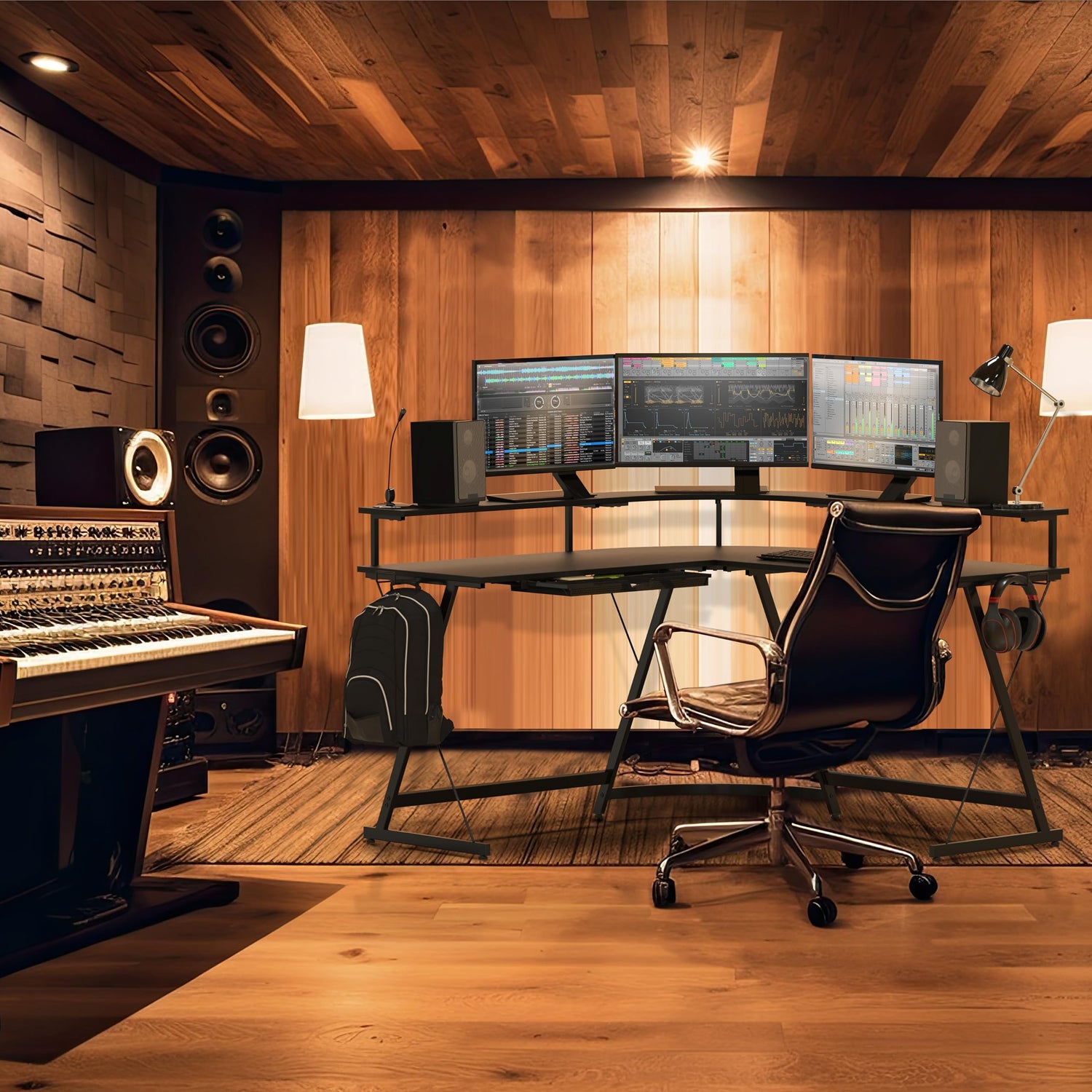 - L-shaped 3 piece corner computer desk saves space in home office, dorm room.