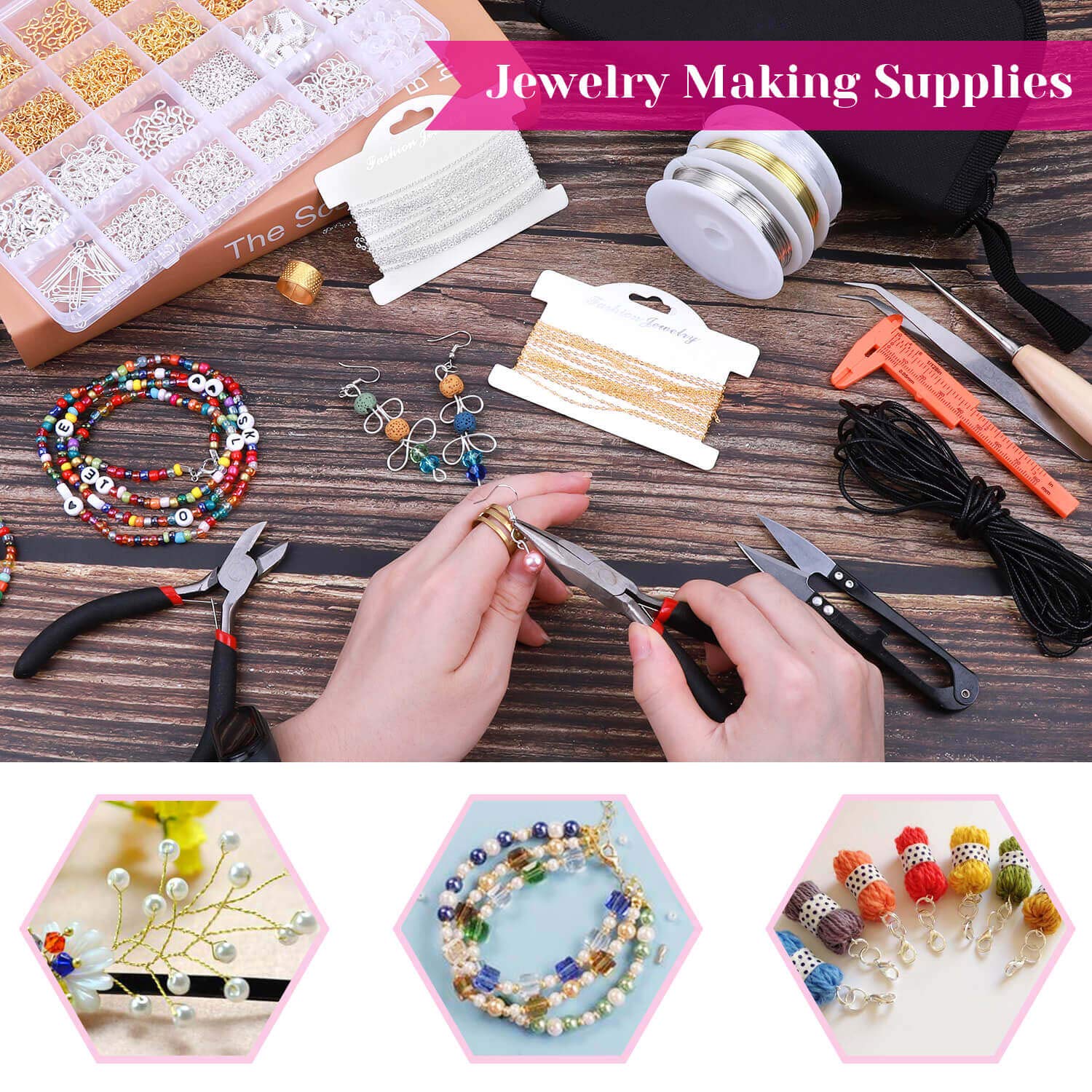 - 【Include All You Need】Shynek jewelry making supplies kit includes 3 jewelry pliers, 2 rolls of copper wire, 1 elastic string, 1 waxed necklace cord, 2 rolls of necklace chain, 6 needles, 2 tweezers, 1 caliper, 1 awl, 1 jump ring opener, 1 thimble ring, 1 thread scissors, 1 tape measure, 3 needle threaders, 1 zip pouch, 1 adjustable helping hands, 1830Pcs jewelry findings, Including the basic tools and findings you need for most projects for earring making, necklace repair and bracelet fix