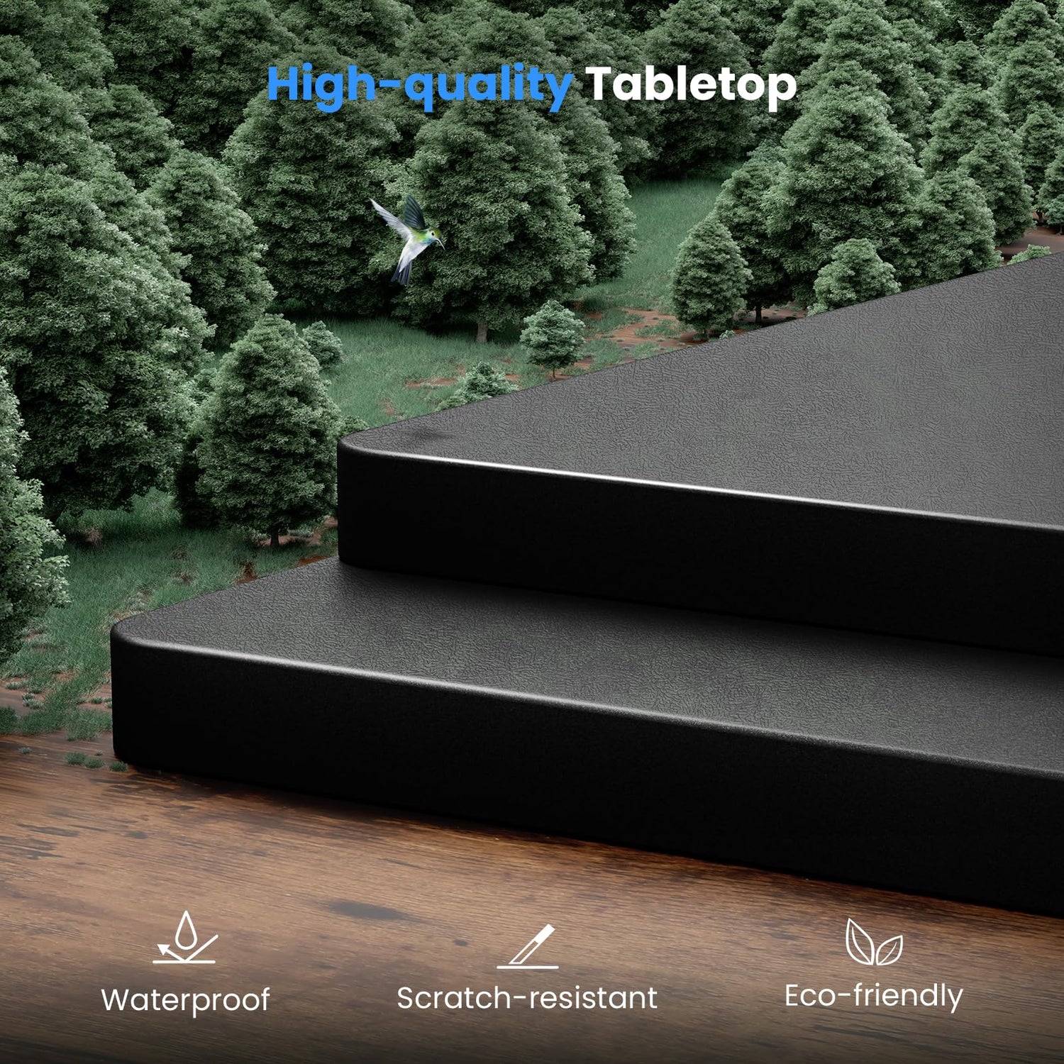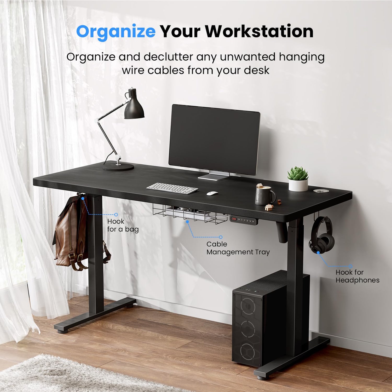 - Organize Your Workstation : 63"x24" eco-friendly desktop provides you with a spacious workspace. (The 40-inch version is a whole-piece) Integrated cable management tray and hooks for headphones or bags, ensuring a tidy workspace. Say goodbye to cable chaos and focus on what matters!