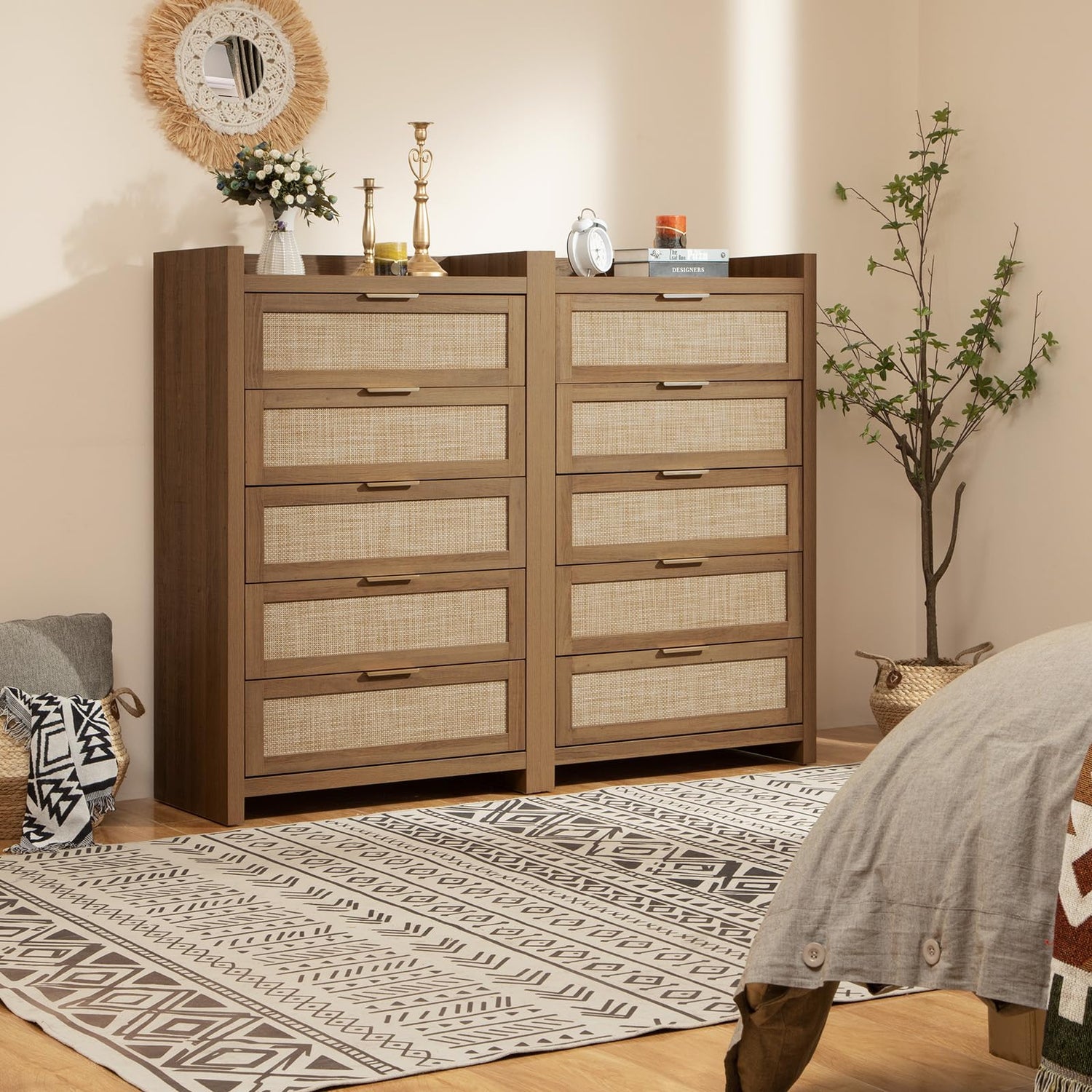 SICOTAS Dresser for Bedroom Chest of Drawers Tall Dresser with 5 Rattan Drawers Wood Dresser for Closet Boho Clothes Storage Tower Large Nightstand Sets for Living Room Hallway Nursery Entryway (2PCS)