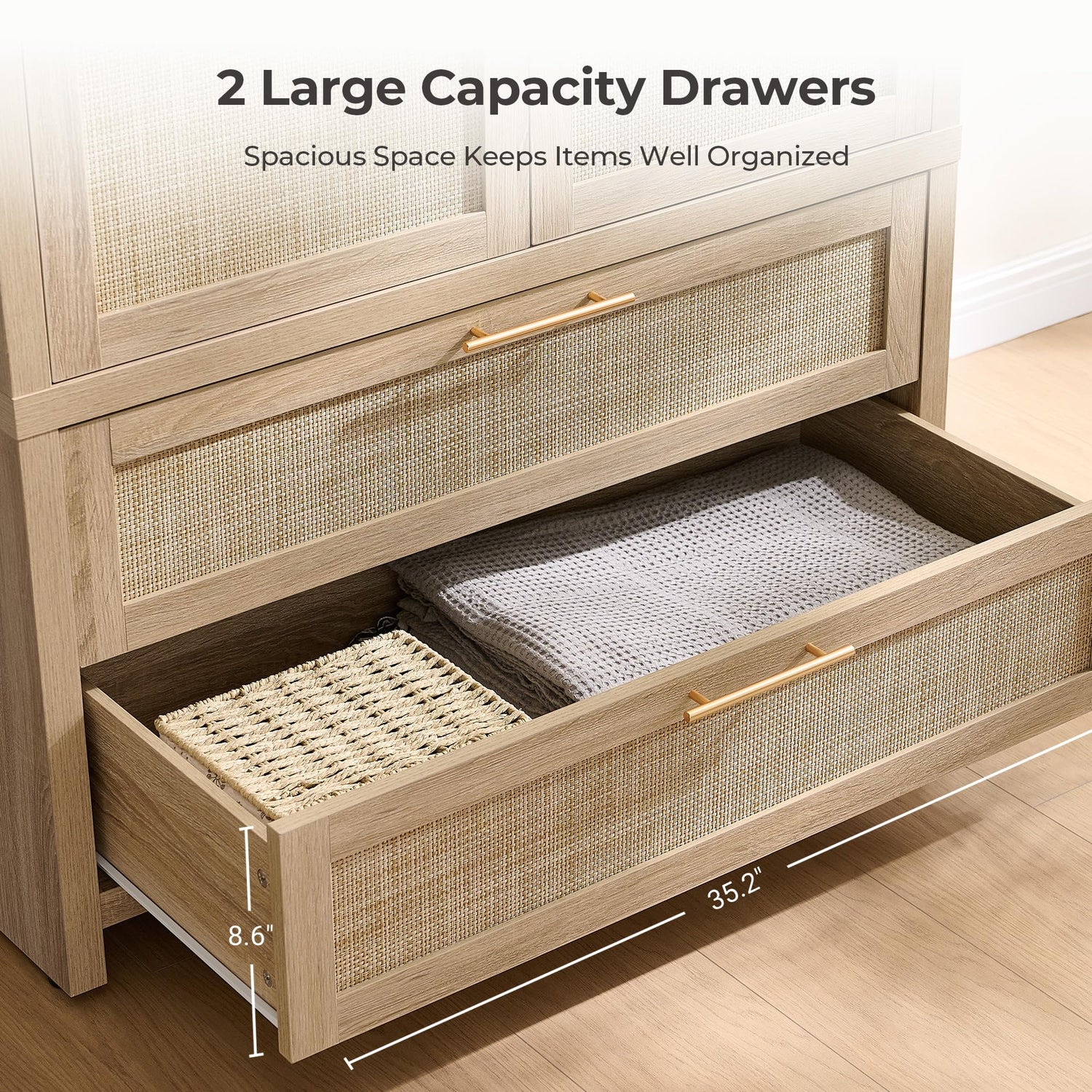 SICOTAS Rattan Armoire Wardrobe Closet Cabinet, 71" Tall Wardrobe Storage Cabinet with Doors, Large Drawers and Hanging Rod, Boho Armoire Clothes Organizer for Bedroom, Cloak Room, Light Oak