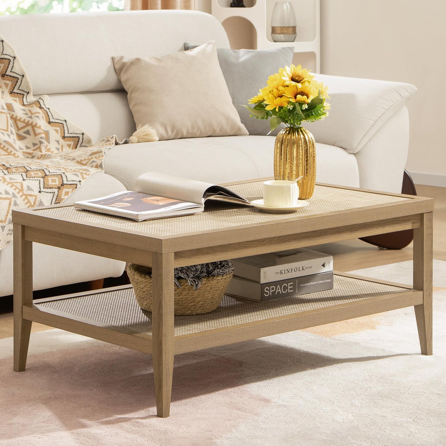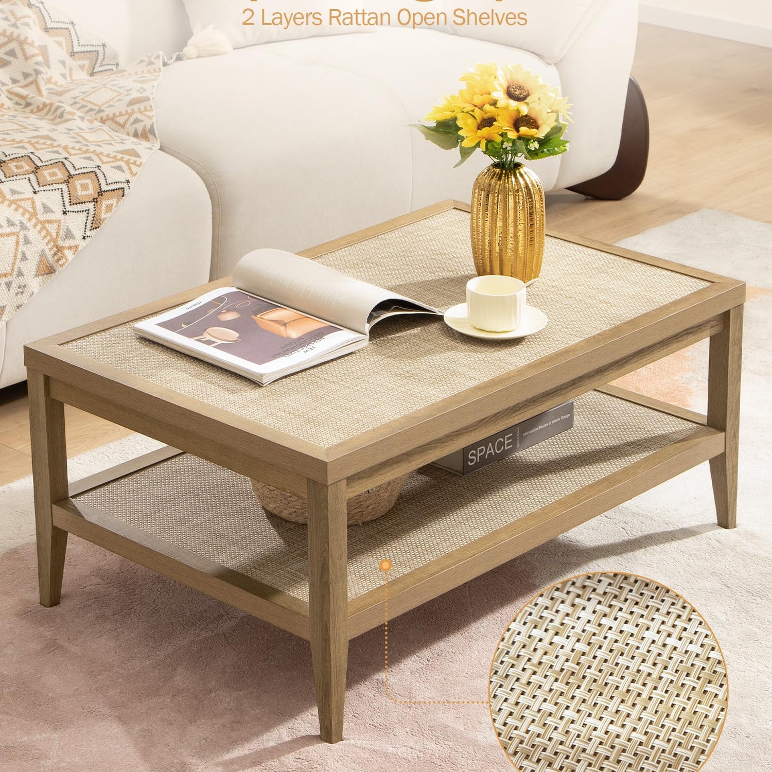 SICOTAS Rattan Coffee Table for Living Room - Boho Rectangle Center Coffee Tables with 2-Tier Rattan Storage Shelves - Accent Sofa Side Table for Small Space