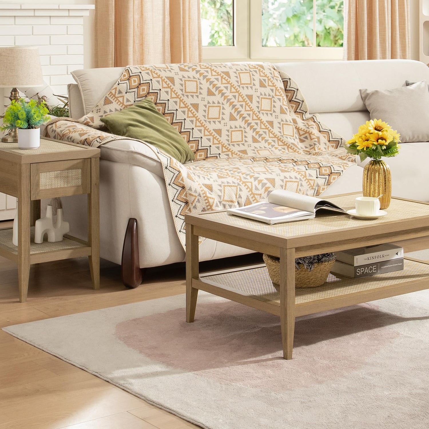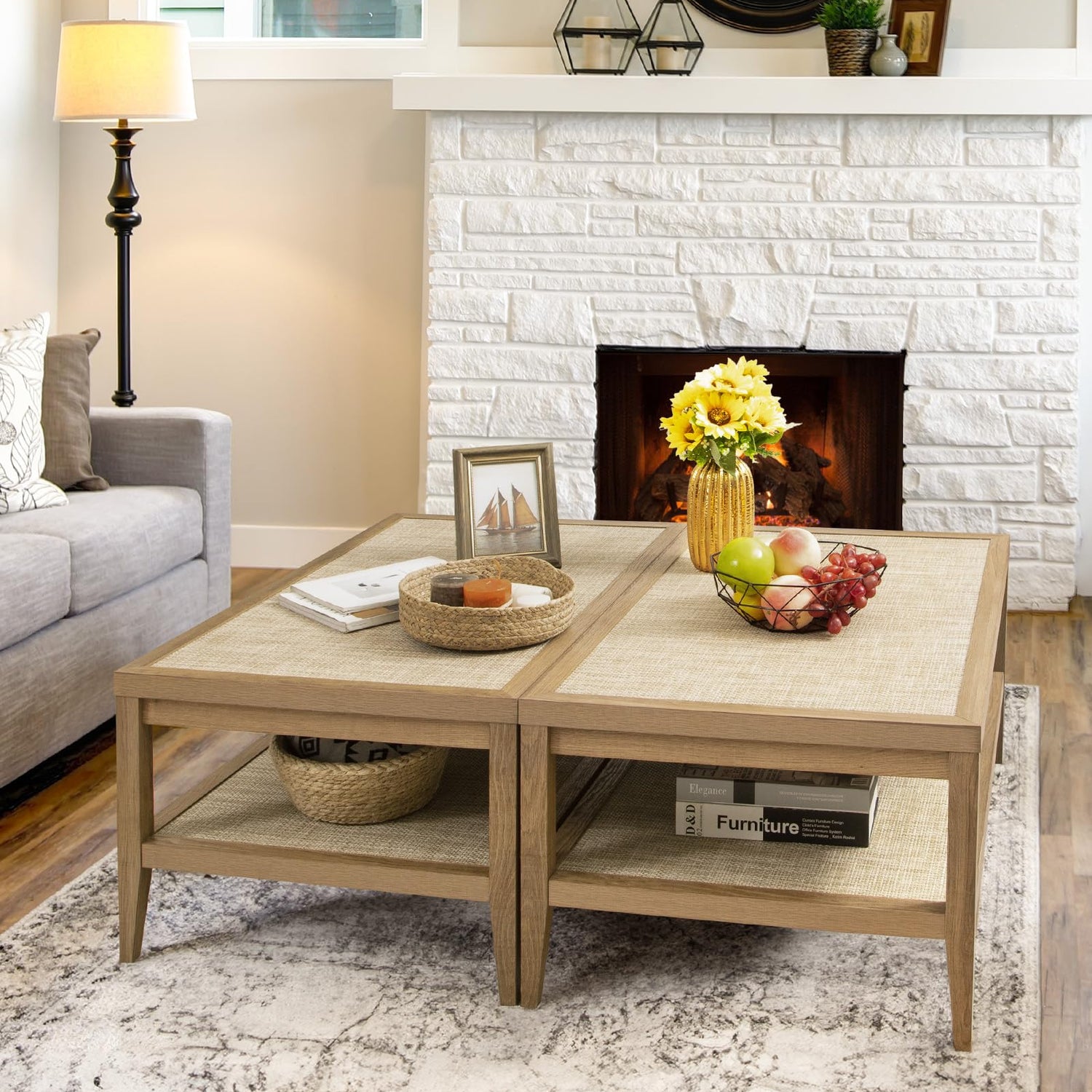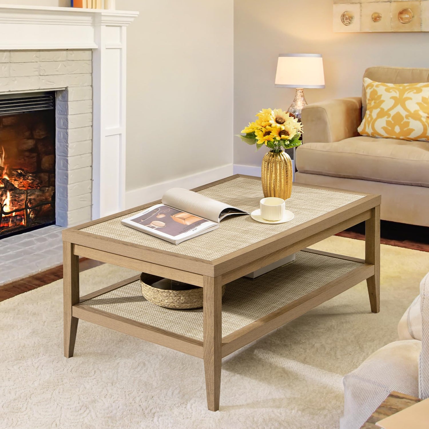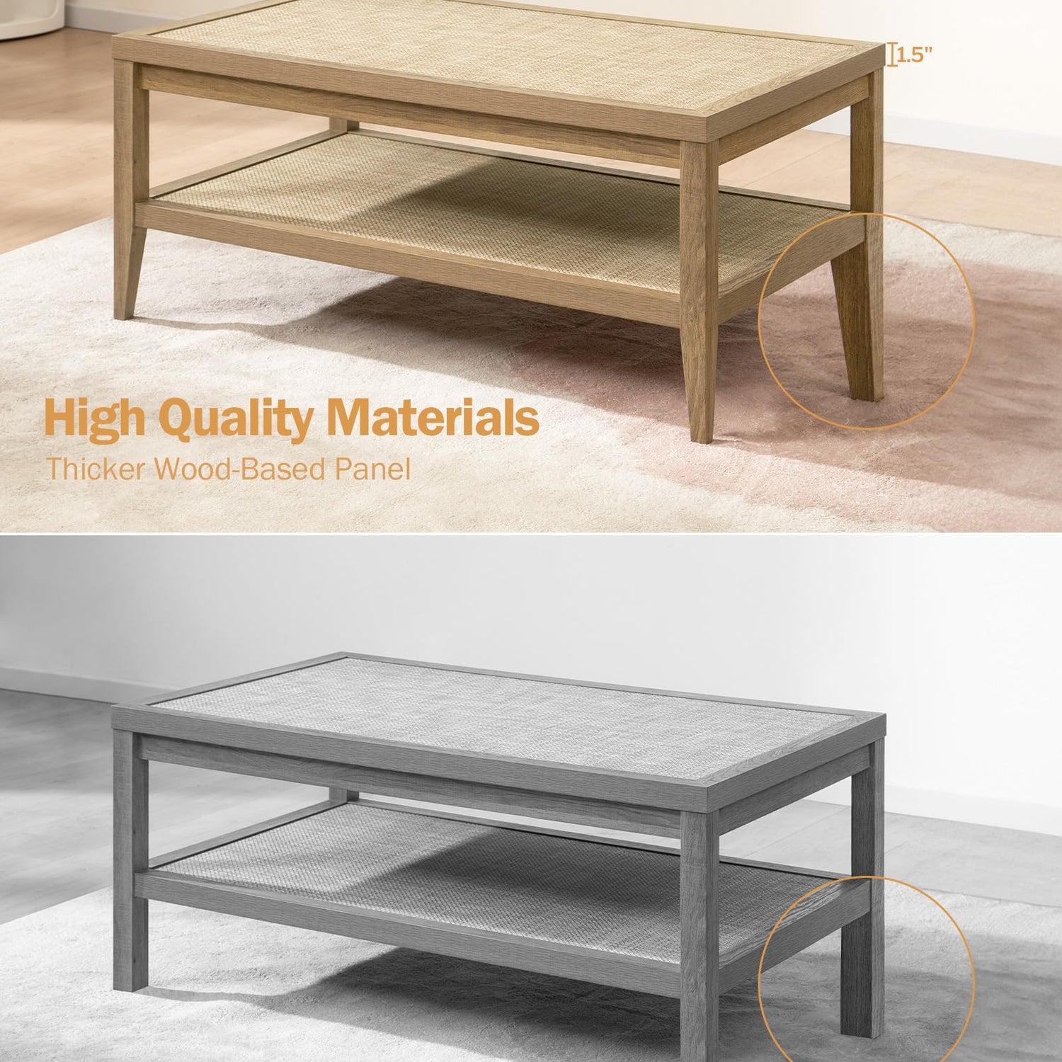 - FARMHOUSE BOHO STYLE - The wooden colour and rattan of this rectangular coffee table give it a natural and rustic charm. The PE rattan shelves panel's exquisite and generous design adds an artistic touch and complements various types of furniture.