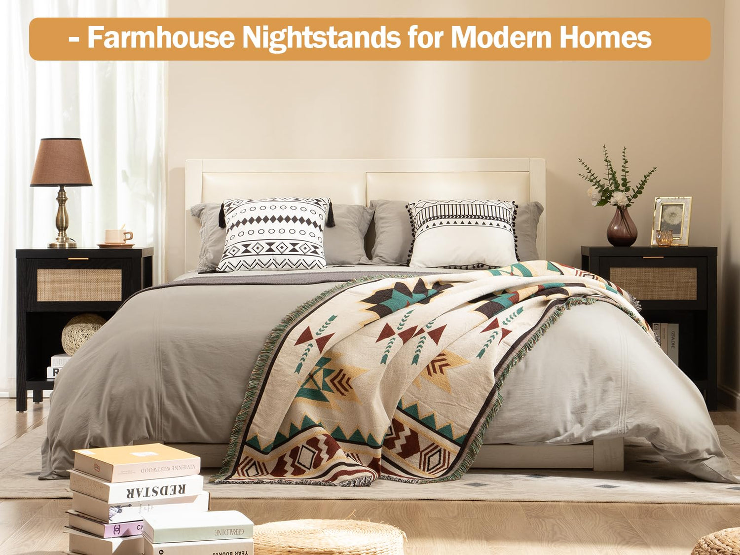 SICOTAS Rattan Night Stands Set of 2, Farmhouse Nightstand Bedside Table with Drawer and Storage Shelf, Boho End Side Table for Bedroom, Small Space, Black Oak