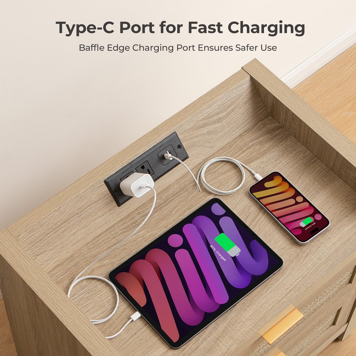 - Nightstand with Type-C Charging Station : Rattan night stand with 2 Power Outlets, 1 Type-C Port (Note: only for iPhone charging cable fast charging), 1 USB Port will fully satisfy your charging needs. Charging Port in the Baffle, rather than on the table: You don’t have to worry about electric shock caused by spilled coffee, water, etc.