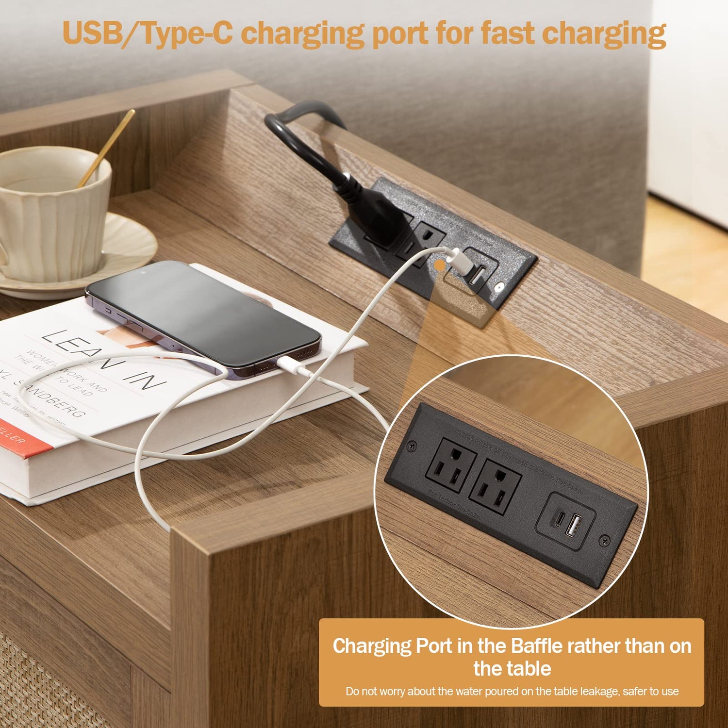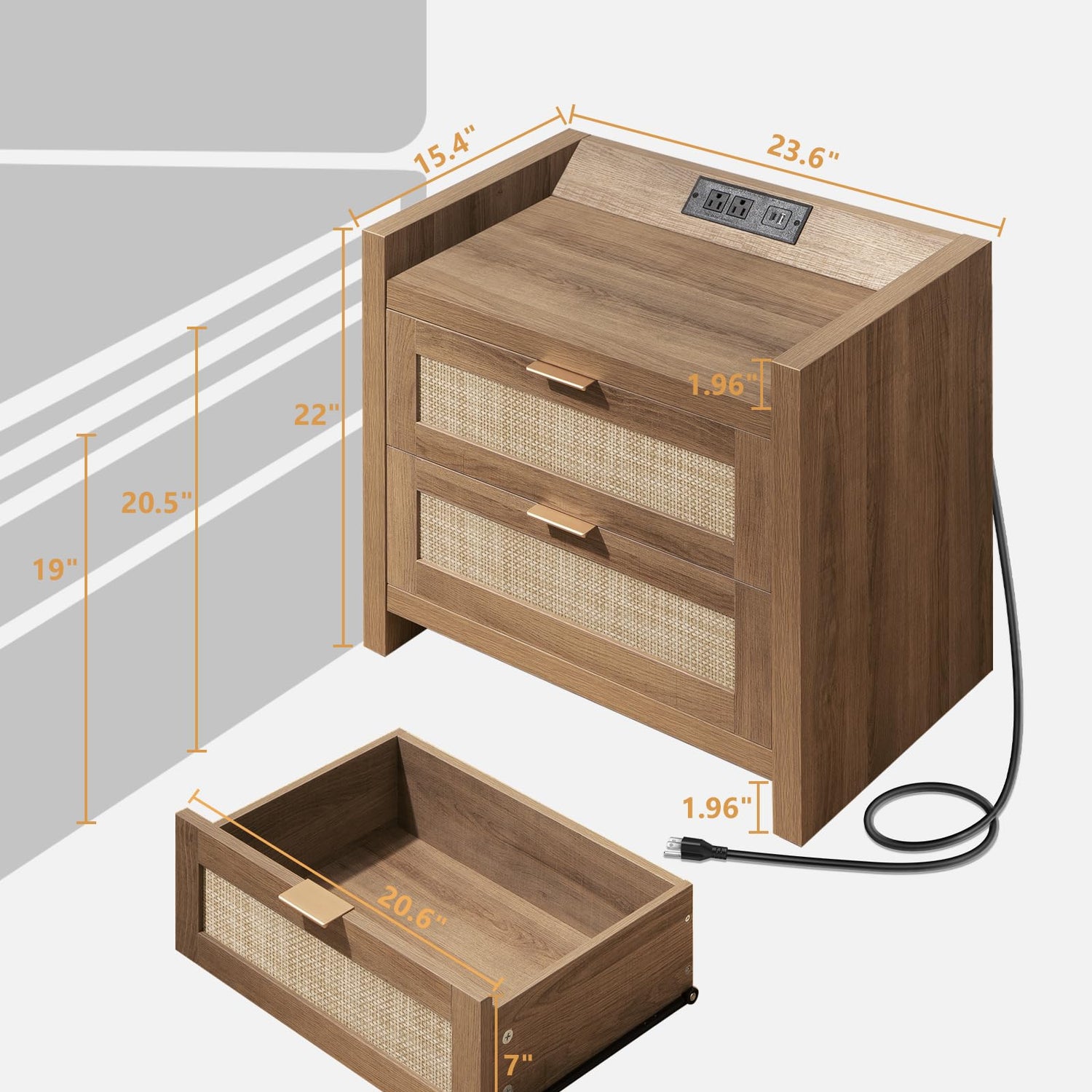 - Upgraded Rattan Nightstand with Type-C Port : This rattan nightstand with 2 Power Outlets, 1 Type-C Port (Note: only for iPhone charging cable fast charging), 1 USB Port will fully satisfy your charging needs. Charging Port in the Baffle, rather than on the table: You don’t have to worry about electric shock caused by spilled coffee, water, etc. Note: The nightstand are wider, but the height is 22 inches, so if you have a taller bed, please compare the height of your bed before purchasing~