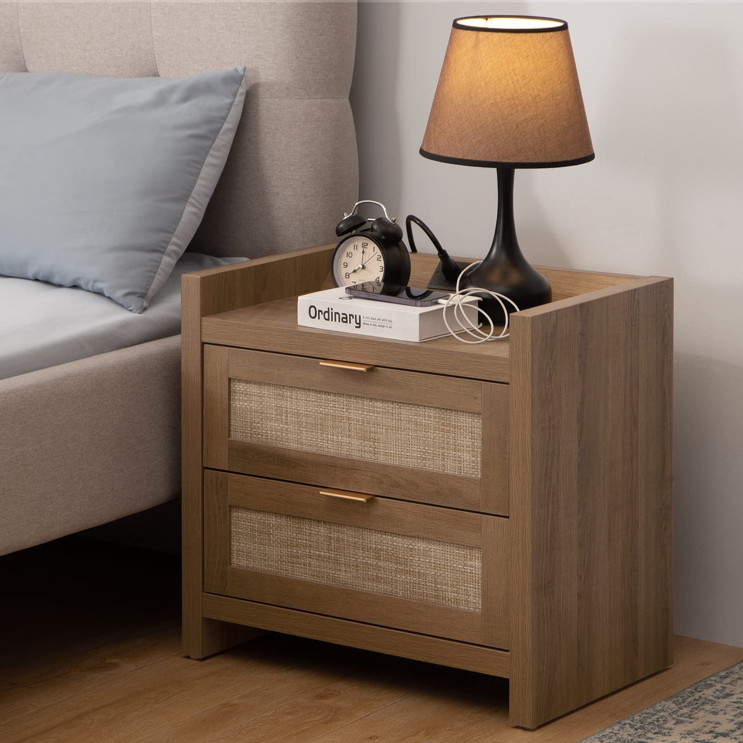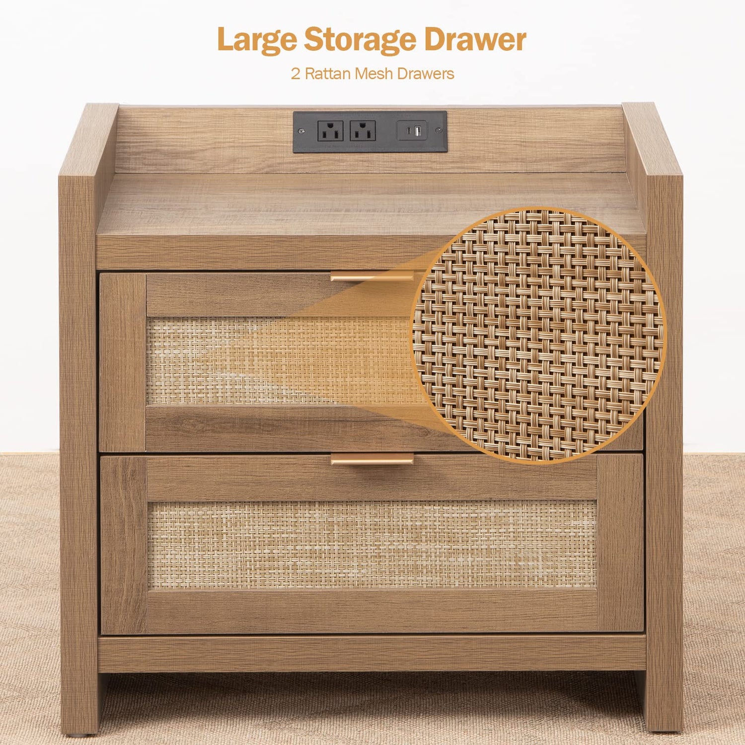 SICOTAS Rattan Nightstand End Table : Wood Night Stand with Type-C Charging Station,2 Drawers Storage - Boho Night Stands Bedside Table for Bedroom - Natural Oak