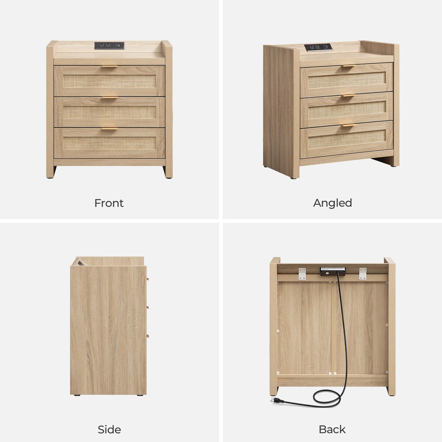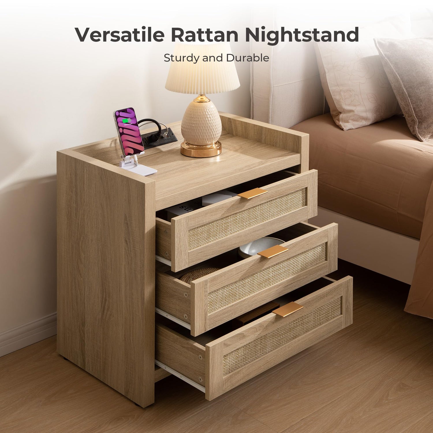SICOTAS Rattan Nightstands Set of 2 Bedside Table - Larger Night Stand with Type-C Charging Station, 3 Drawers Storage - Boho Night Stands End Table for Bedroom - Light Oak