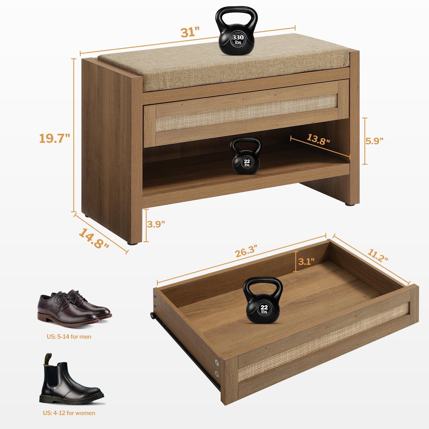 - 【Say Goodbye to Clutter】Measuring 31" W x 15" D x 20" H, the entryway bench features a 3.1" deep pull-out drawer for secure storage of keys, wallets, and gloves. With an open shelf and ample space underneath, you can easily stow away 6-8 pairs of everyday shoes or sports gear.