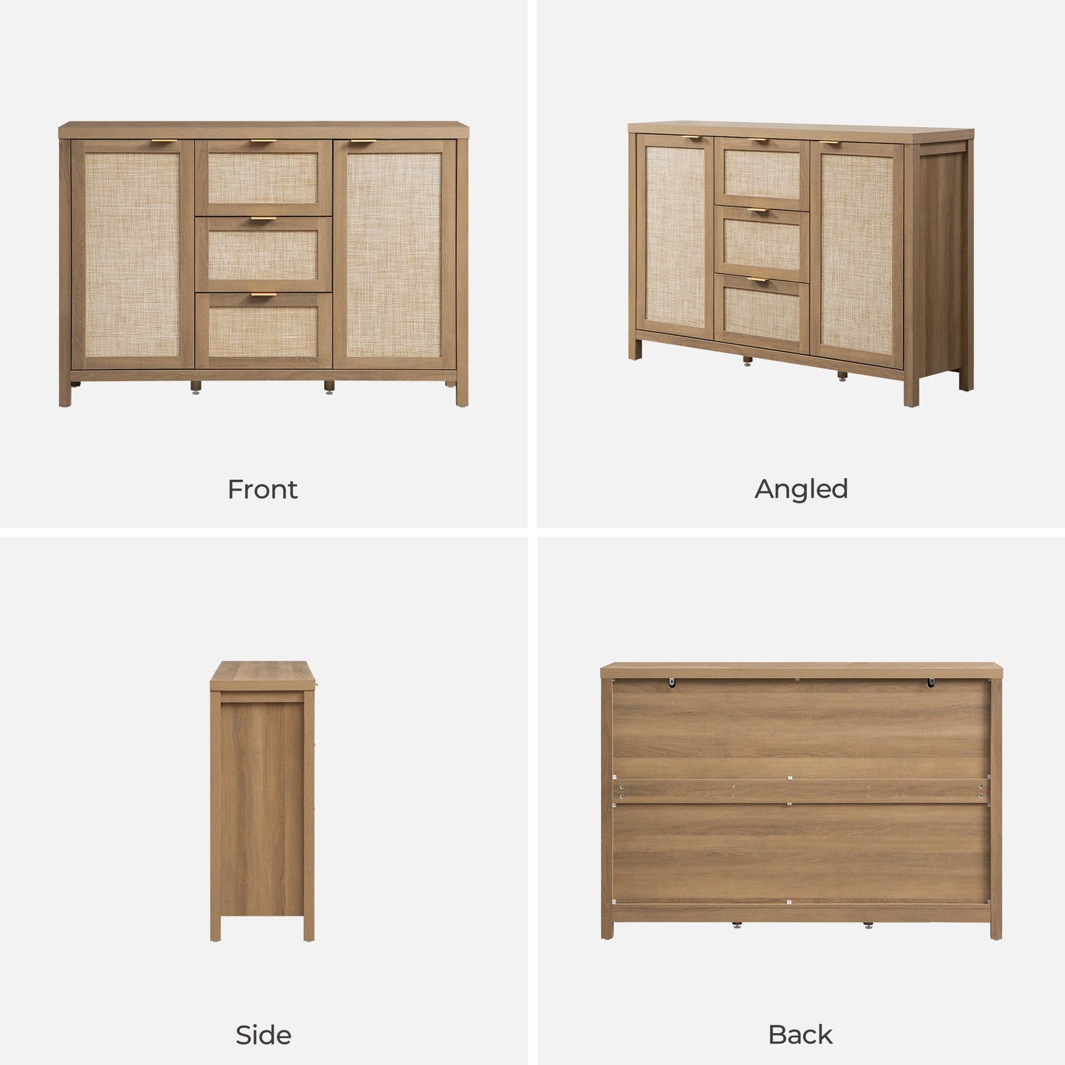 SICOTAS Rattan Sideboard Buffet Cabinet with Storage - 52" Larger Farmhouse Credenza Storage Coffee Bar Cabinet with 3 Drawers & 2 Doors, Boho Console Table for Living Room, Kitchen, Caramel Oak