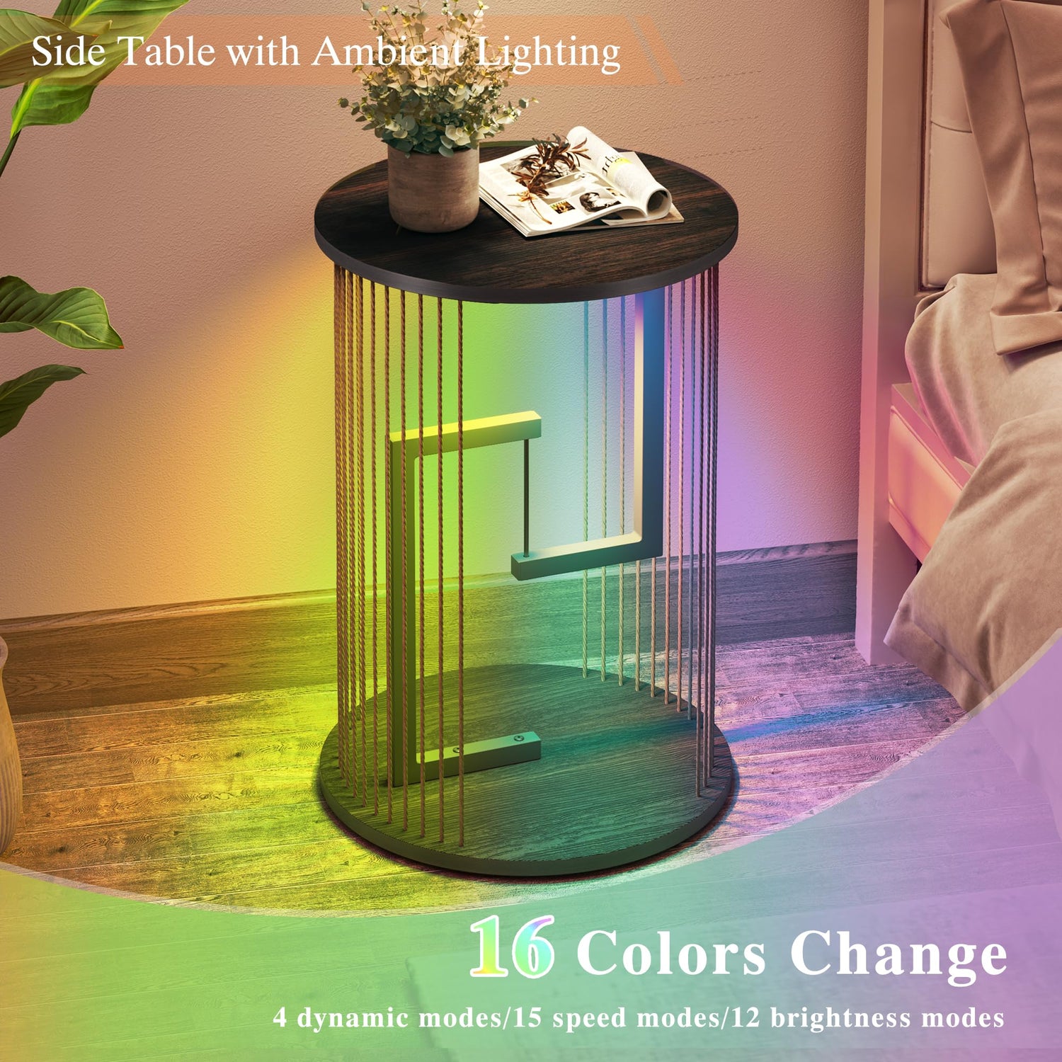 Side Table, Round End Table for Living Room, Bedroom, Black LED Nightstand with Twine Rope Design, Mid Century Modern Wood Accent Coffee Table, Antique Nightstand
