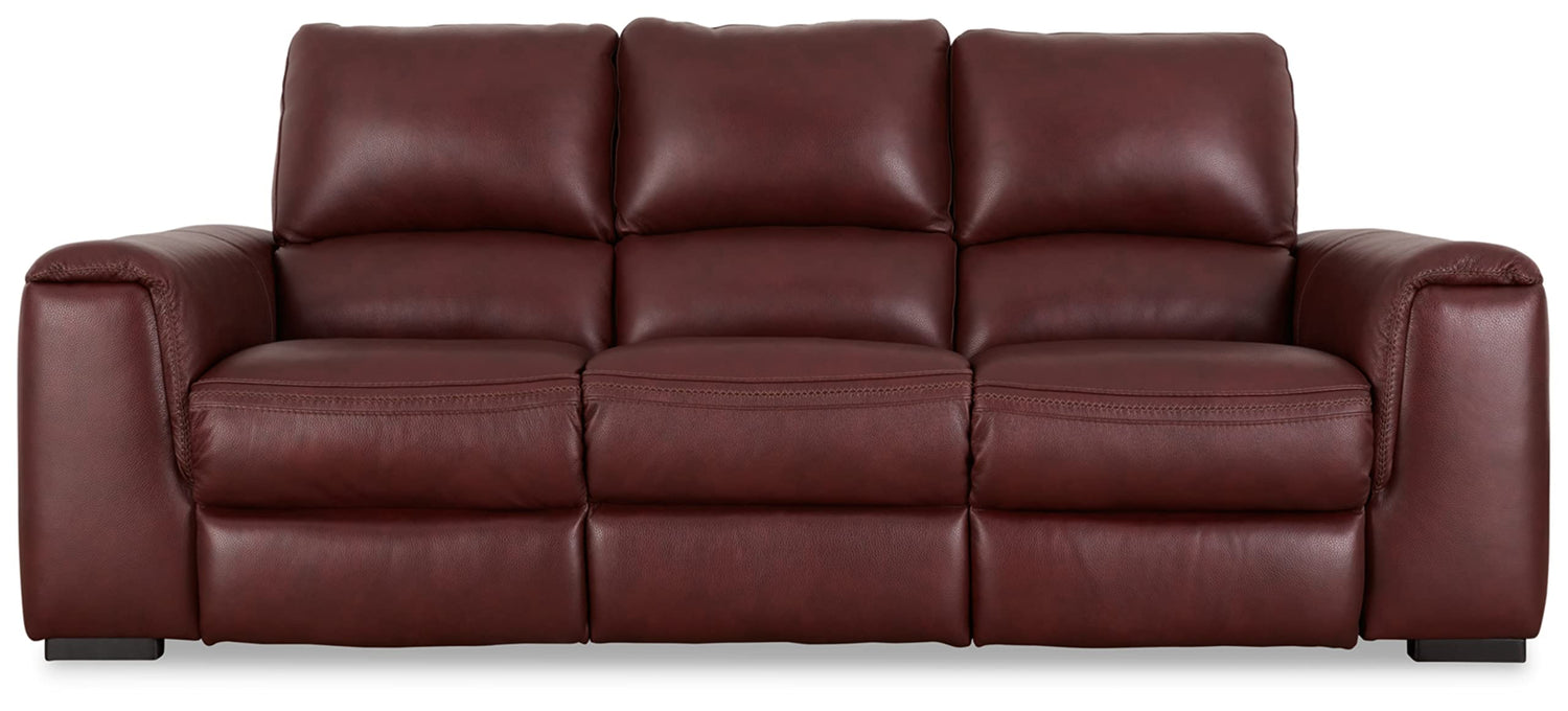 Details: Impressive in scale while keeping an air of refinement, this power reclining sofa stuns with soft, supple leather match upholstery in garnet. Sink into real leather in the seating area and inside back while catering to your comfort with one-touch power reclining and an adjustable headrest. Complete with USB charging, this sofa makes a surefire statement in your contemporary living room. When you're ready to transform your dull living room into a comfortable oasis, look no further than our selection of stellar sofas and loveseats for that. We're here to help with a wide selection of recliner sofas, sleeper sofas and so much more. With unmatched prices and quality, we're your one-stop destination for all things home.