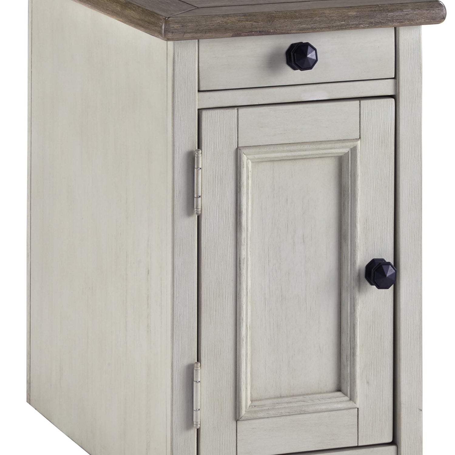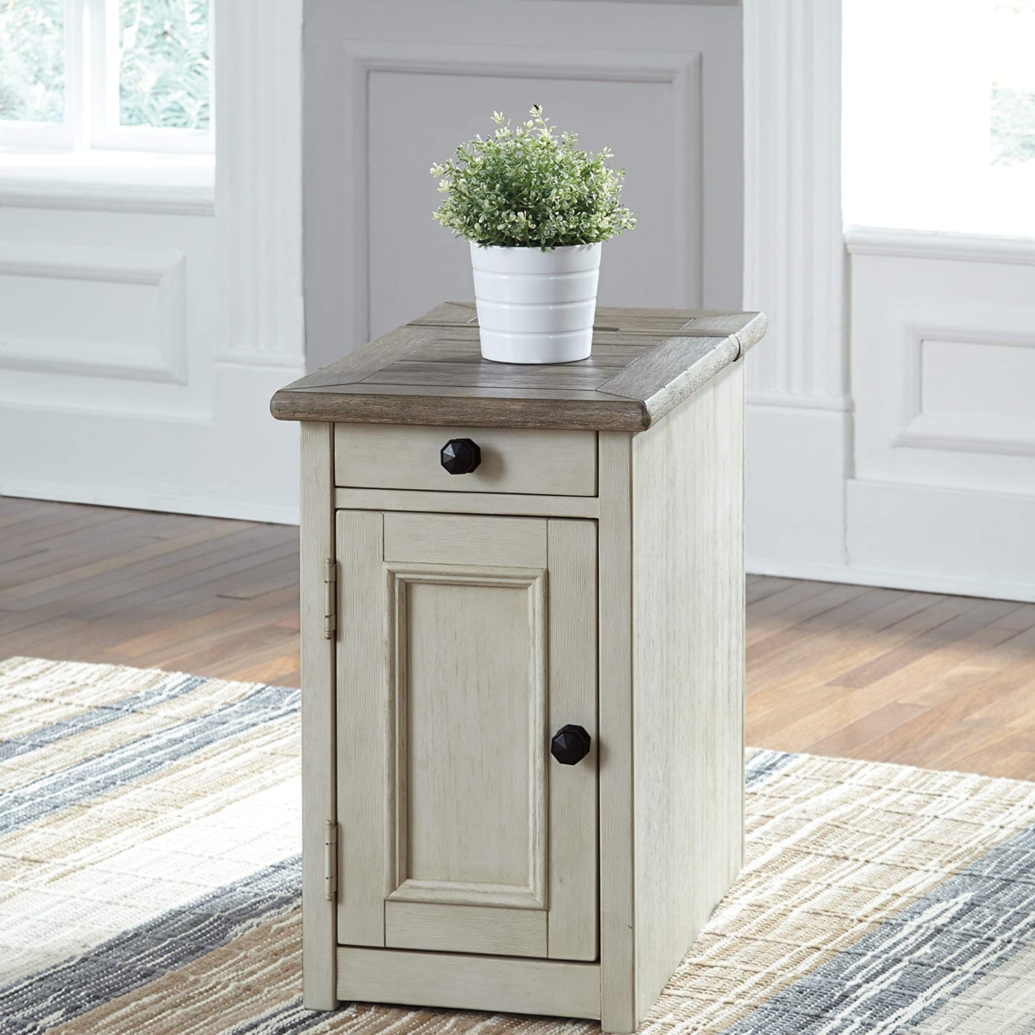 Details: Display and contain your favorite things with this end table. Its textured antique white finish creates a vintage two-tone look, while outlets and USB ports provide functionality. This is a piece you will enjoy for years to come. With a wide variety of styles and materials, accent tables can provide storage in a living room, give guests a spot to rest their drinks, and add subtle drama to your decor by presenting a place for artwork, a lamp or a plant. we have a wide selection of accent tables and occasional tables, from rustic farmhouse designs to modern openwork styles. They come in a variety of sizes, too, so you will find one that fits just where you need it.