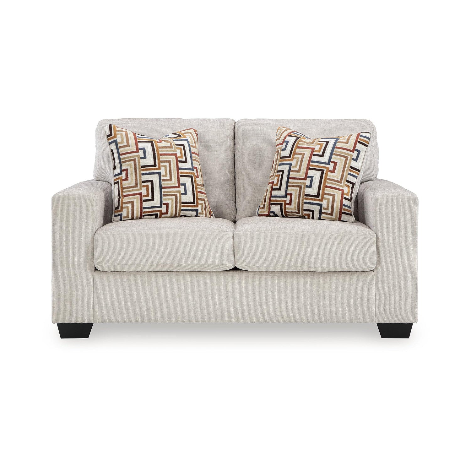 Details: Looking to make a simply chic statement with color? Liven up your living room with this loveseat. Its trend-right light neutral upholstery is a perfect blank canvas for adding pops of color. Bold and eclectic accent pillows complete the look. Pairing posh style with everyday comfort, this piece is a welcome addition to contemporary spaces.