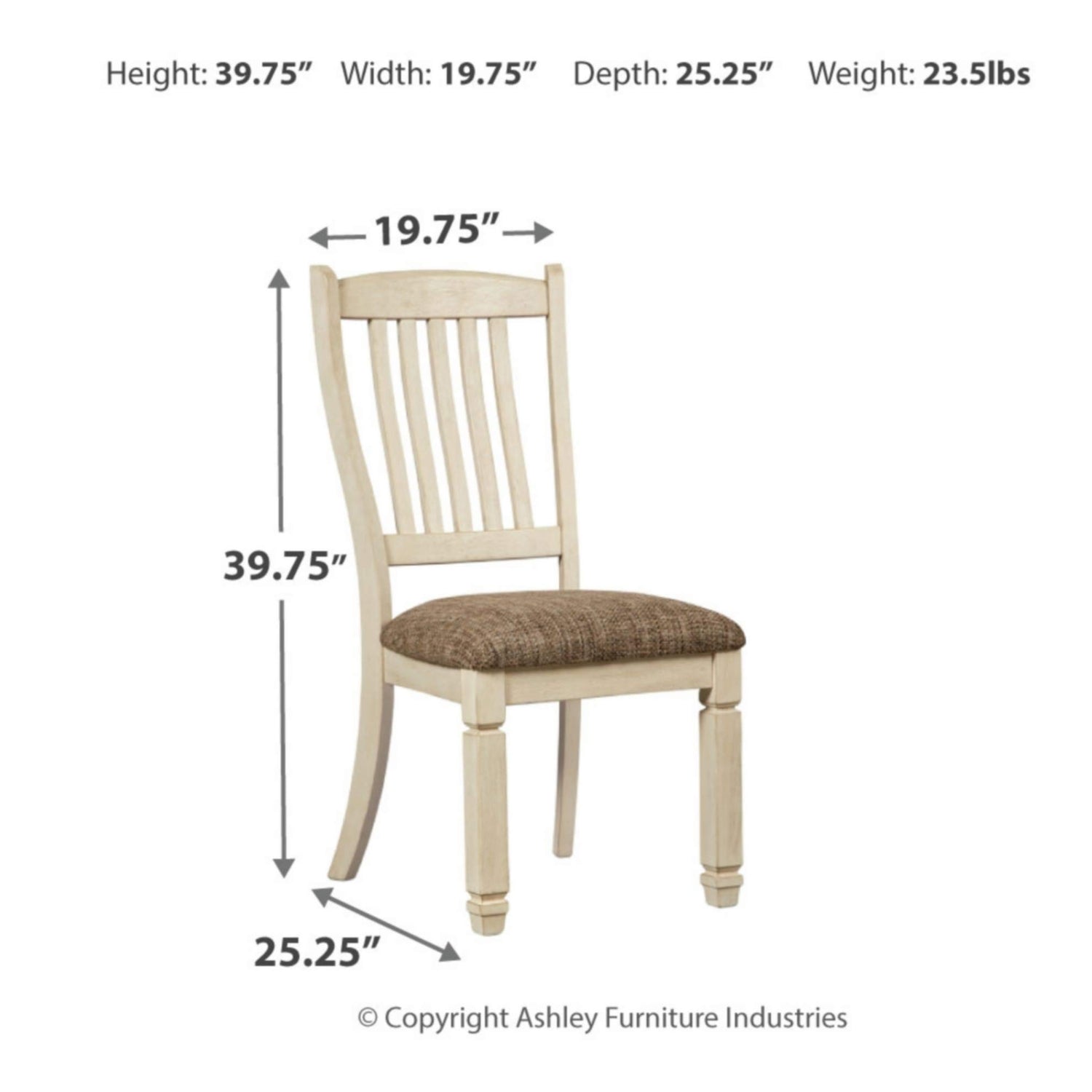 Details: The beauty of the Bolanburg upholstered dining chair is something to savor. Designed to serve up comfort and flair, this rake-back dining chair entices with a cushioned seat covered in a heavy woven fabric that complements the chairs antique white finish. Features : - Made of solid wood - Antique white finish - Cushioned seat upholstered in heavy woven polyester fabric. Specifications : - Product Dimensions : 39.75" H x 19.75" W x 25.25" D - Seat Dimensions : 19.5" H x 19.75" W x 18.5" D - Product Weight : 19 lbs - Assembly Required : Yes.
