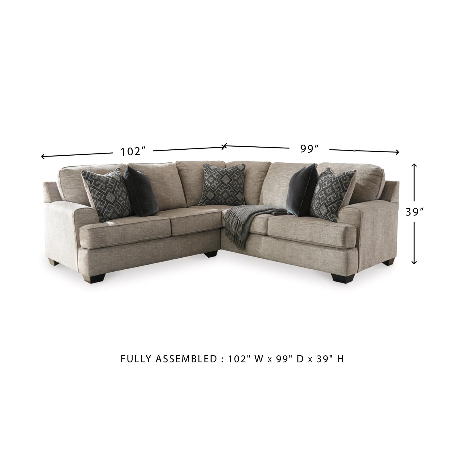 - DIMENSIONS: Measures 102" W x 99" D x 39" H. Includes 2 pieces: right-arm facing sofa with corner wedge and left-arm facing loveseat. "Left-arm" and "right-arm" describe the position of the arm when you face the piece