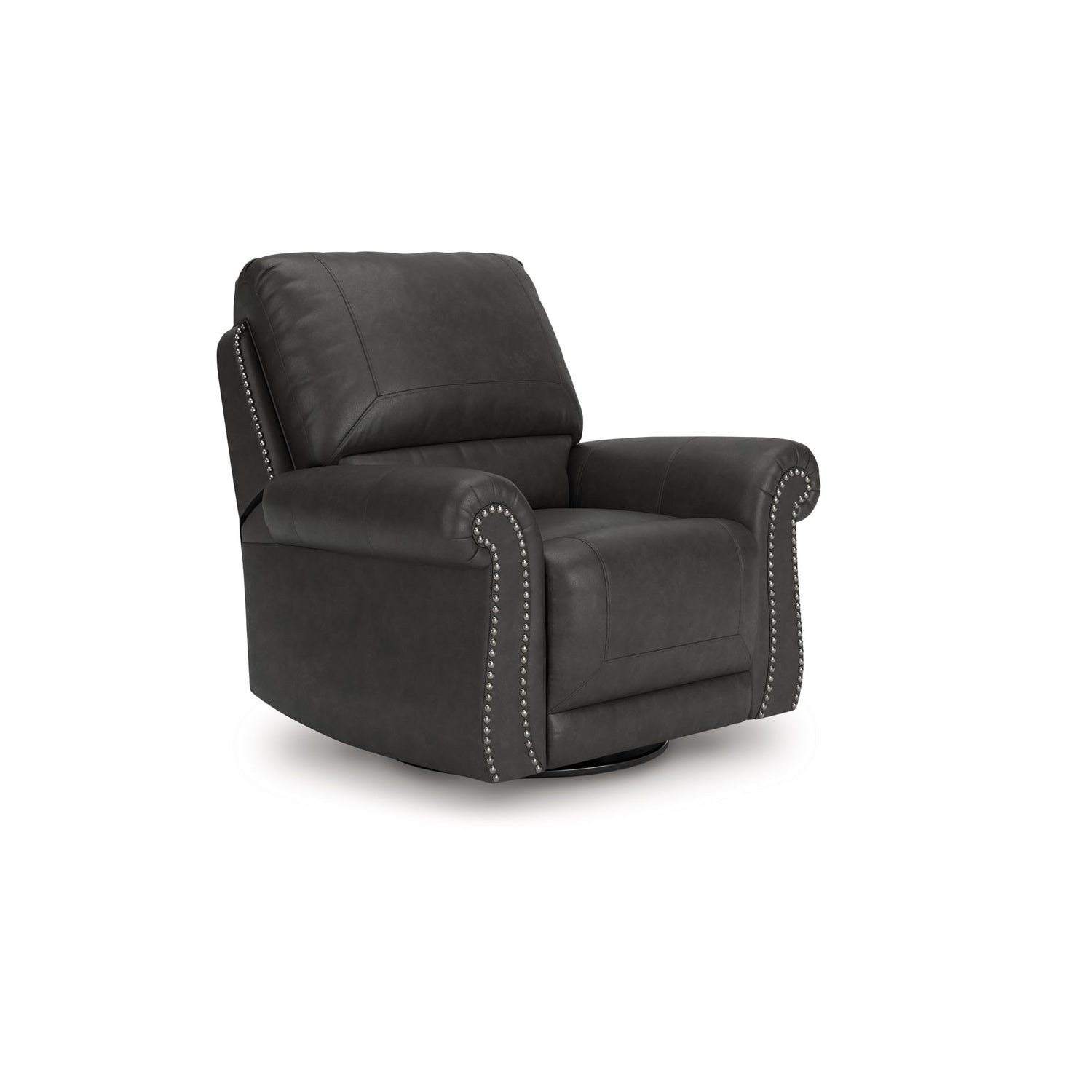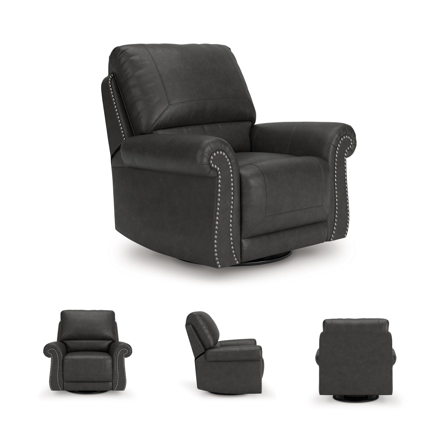 - SWIVEL GLIDER RECLINER: Nailhead trim puts the finishing touches on the classic roll arms of this recliner. Comfy cushions are wrapped in a rustic yet sleek faux leather. The reclining motion & 360-degree swivel keep you in the flow of conversation.