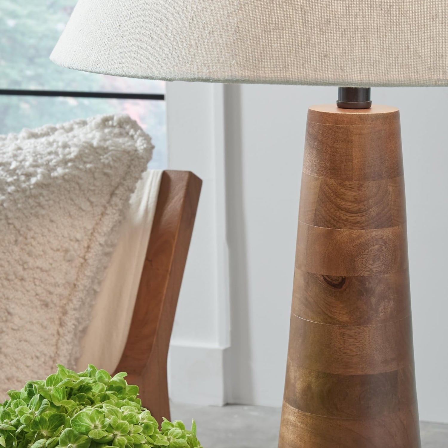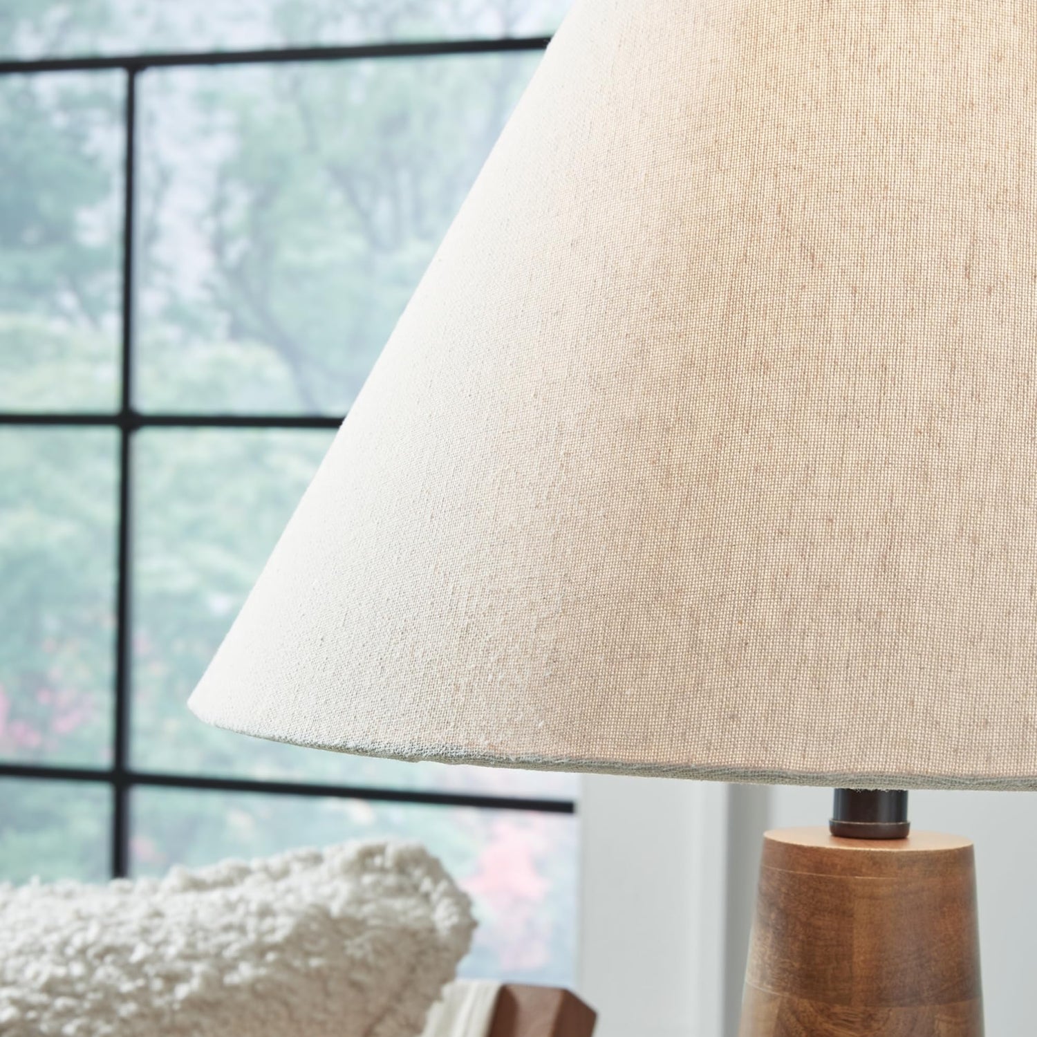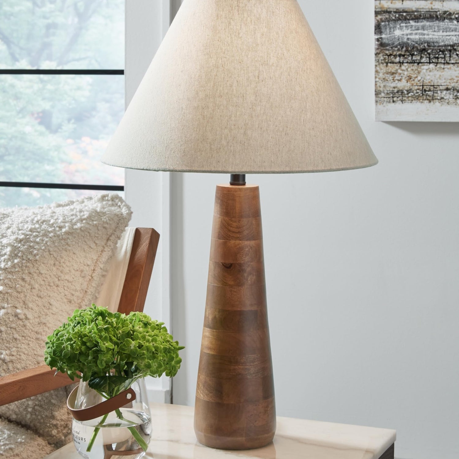 Details: Clean, contemporary style can be sleek and shiny—or subtle and earthy. We love how this table lamp falls into the latter category. Pairing a stylish shade with a wood base bathed in a honey brown finish, it has a delightfully different yet simply illuminating look. It's the perfect accent when staged in the living area or entryway. Signature Design by Ashley is a registered trademark of Ashley Furniture Industries, Inc.