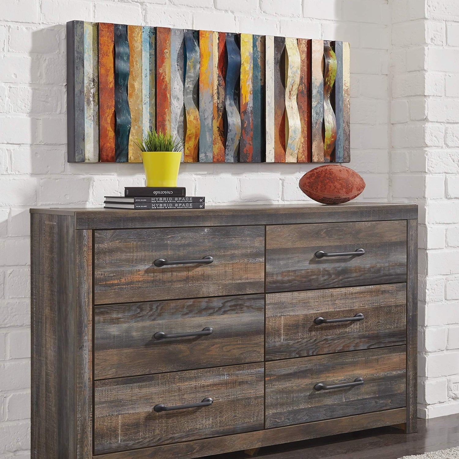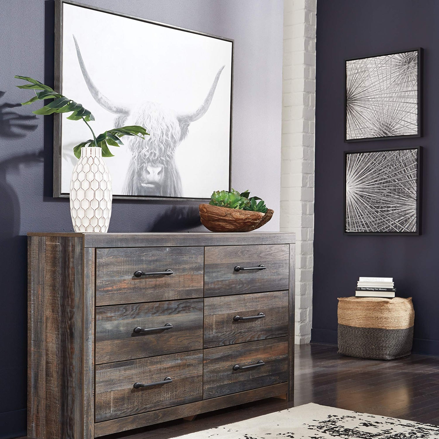 Details: When merged in just the right way, rustic and industrial styles can make one happy marriage. Case in point: this bedroom dresser. A refined take on barn board beauty, its complex, replicated wood grain showcases hints of burnt orange and teal tones for a sense of weatherworn authenticity. Elongated drawer pulls elevate the aesthetic. Whether you need storage space for clothes, linens or toys, you're sure to find the right fit. Your dream bedroom is closer than you think–our wide selection of finishes and features fulfill your decor needs, from casual to contemporary. And we go the extra mile to package, protect and deliver your purchase in a timely manner.