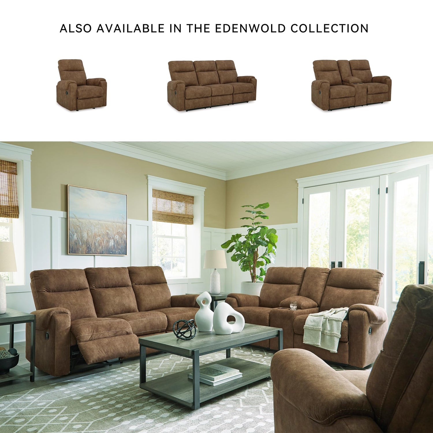 Signature Design by Ashley Edenwold Contemporary Faux Leather Manual Reclining Loveseat with Console, Storage and Cup Holders, Dark Brown