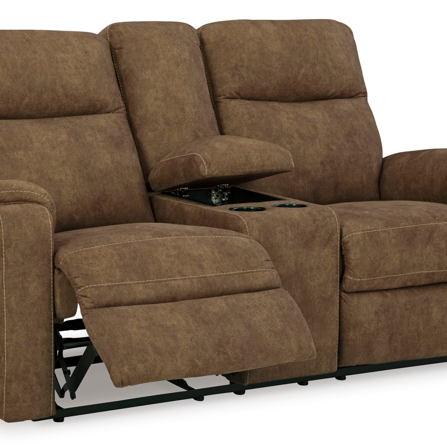 Details: This reclining loveseat with console is your best shot for comfort and total relaxation. Its super soft faux leather, contemporary bustle back and contrast stitching team up for a big win with most any color scheme and room decor. With the pull tab reclining motion, you're on your way to endless relaxation at home solo or when hosting friends.