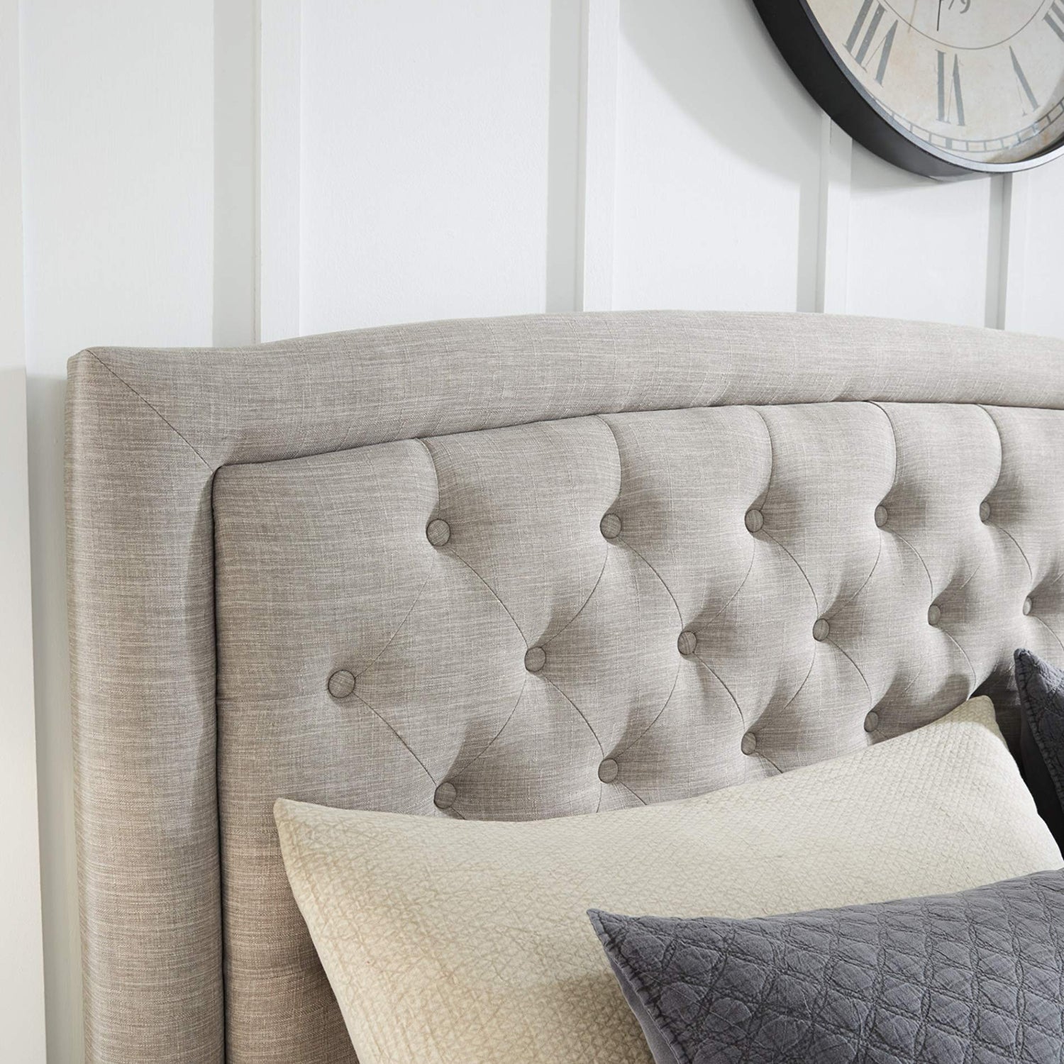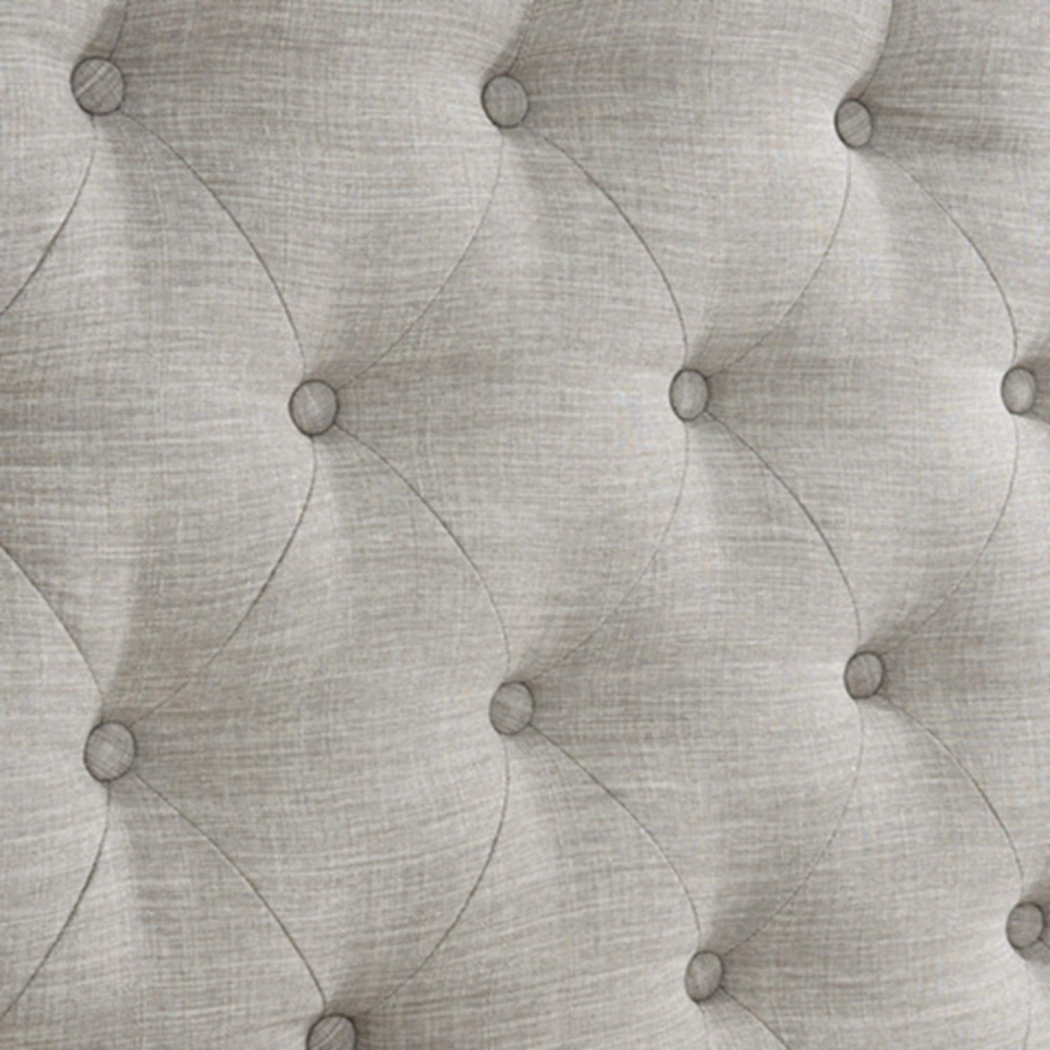- QUEEN UPHOLSTERED BED: This beautifully upholstered queen bed with light gray upholstery gracing the arched button-tufted headboard sports a textural weave that feels fresh and now
