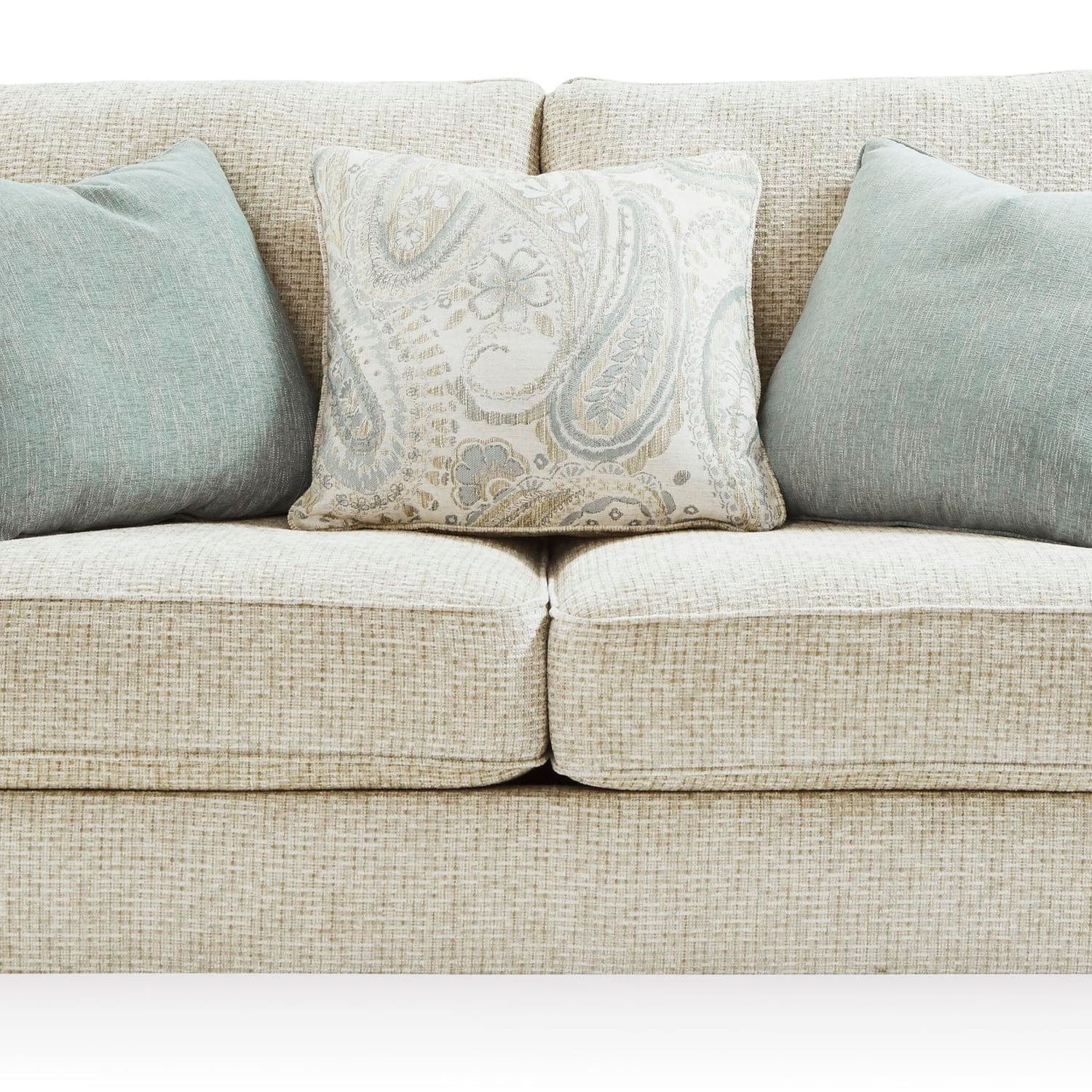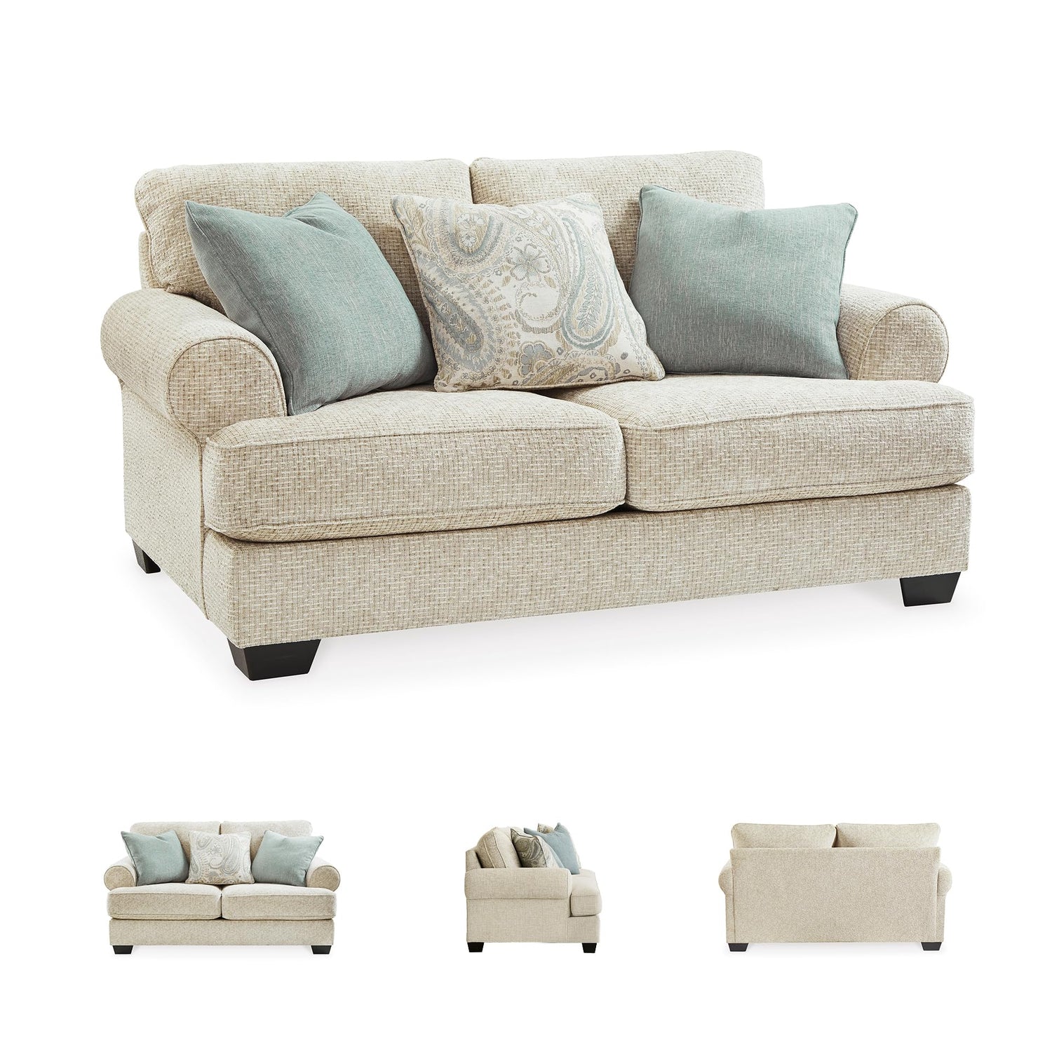 Details: The Monaghan loveseat strikes a beautiful balance between classic and current. Traditional elements include t-cushion seating and setback roll arms, angled for modern flair. Posh collection of pillows in spa mist and jacquard paisley make a muted, mellow complement to the loveseat’s casual textured chenille upholstery. Choice of sandstone beige is a light and lovely style awakening.