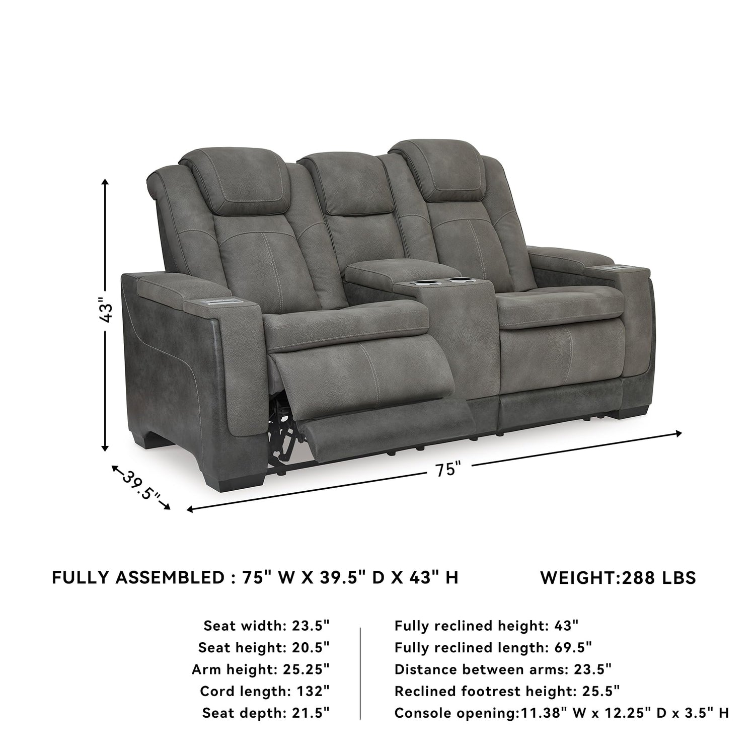 - PERFECT SOFA COMPANION: Measuring 75" W x 39.5" D x 43" H with a fully reclined length of 43", this loveseat sets perfectly by a couch or recliner in your lounge space