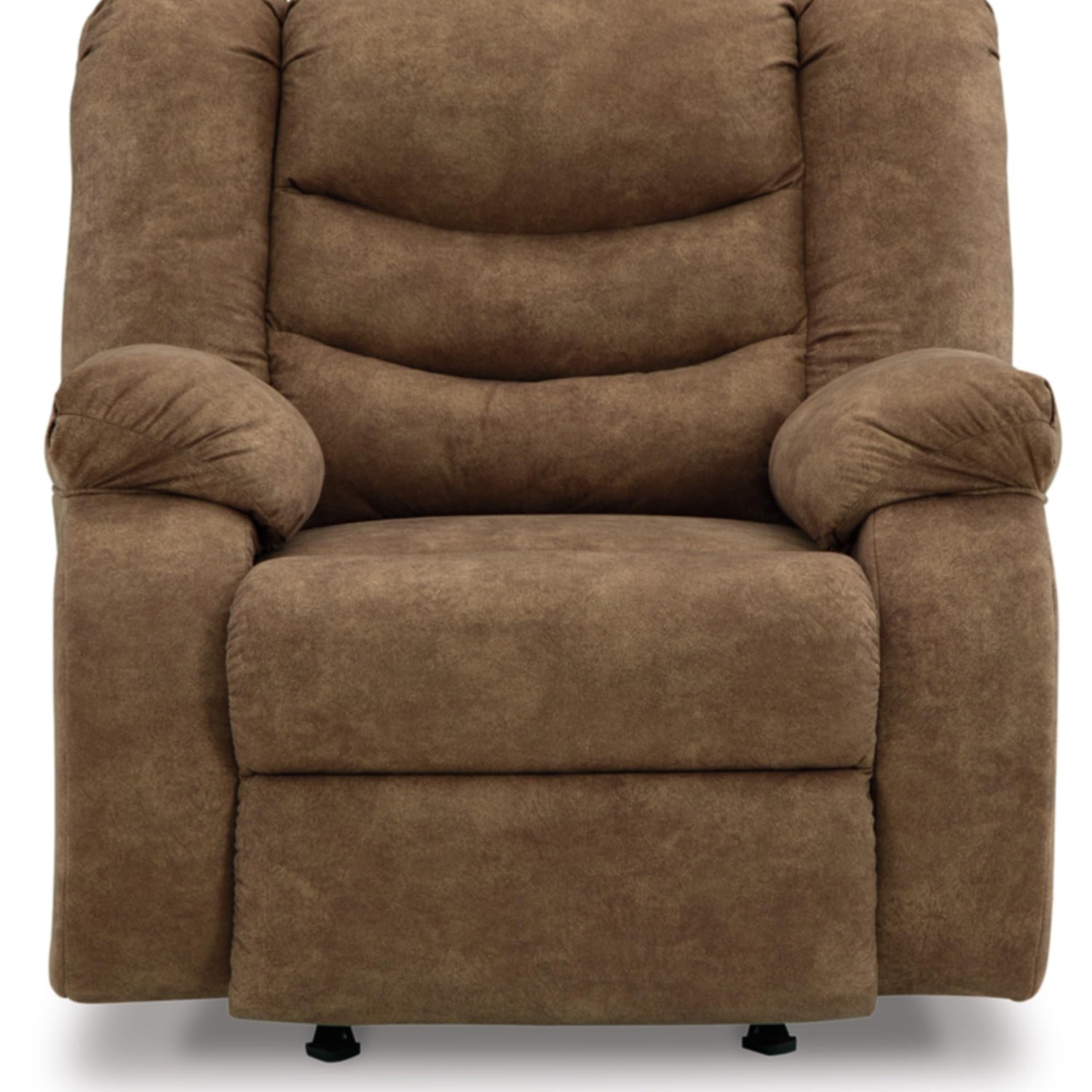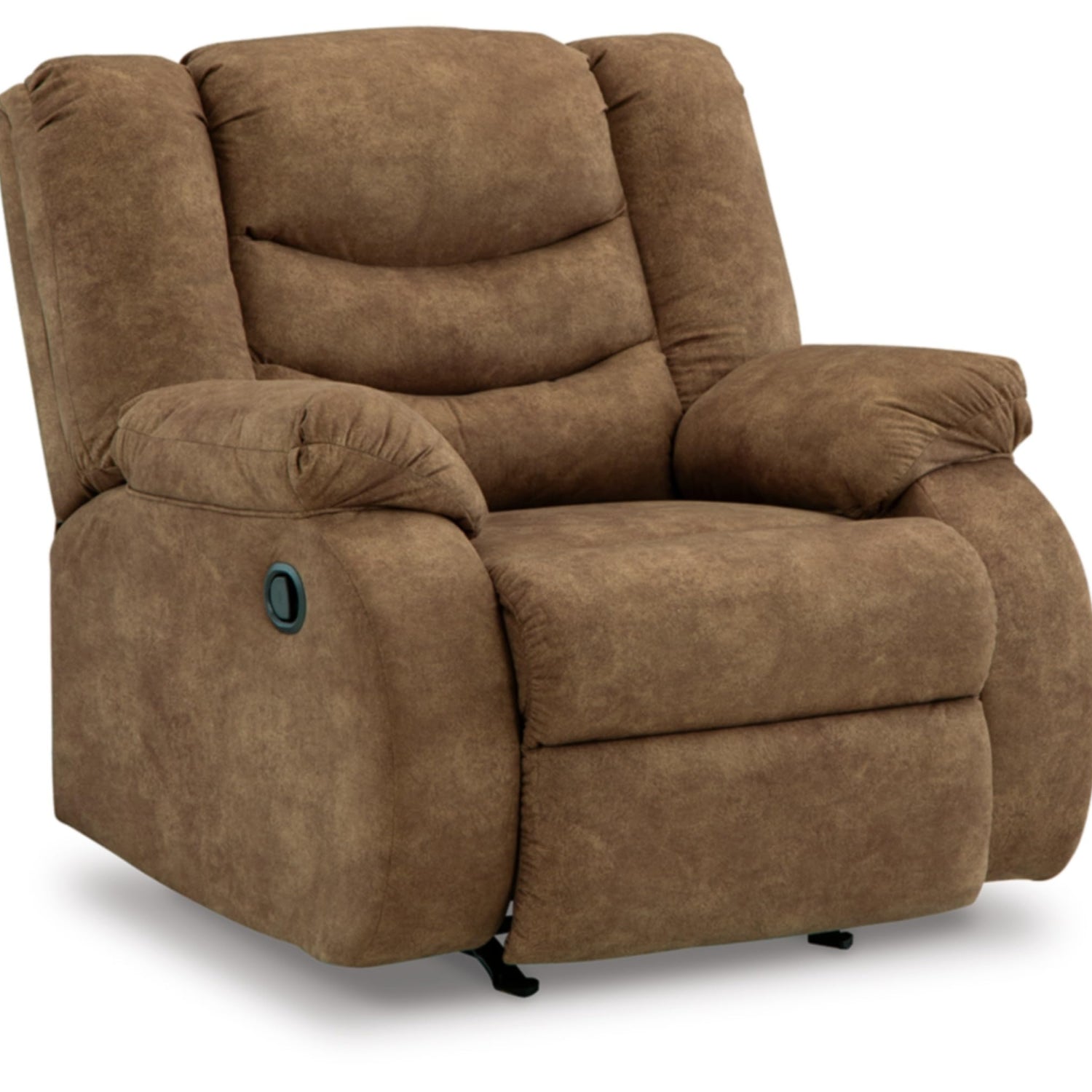 Details: Affordable luxury made easy. This recliner is an essential for living room lounging. Its warm brown faux leather is well-suited to mix and match with your existing pieces. Pull tab reclining keeps you covered when it comes to comfort. And this functional piece is equally as fashionable, with design details like a channel-stitched back incorporating subtle visual interest.